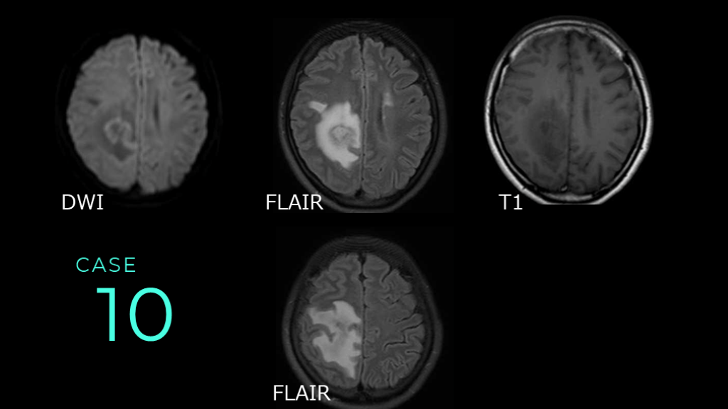 #10. DWIの高信号病変は、まずは脳梗塞を考慮します。脳梗塞は最もコモンな疾患の一つであり、変調があった場合の上位鑑別になります。