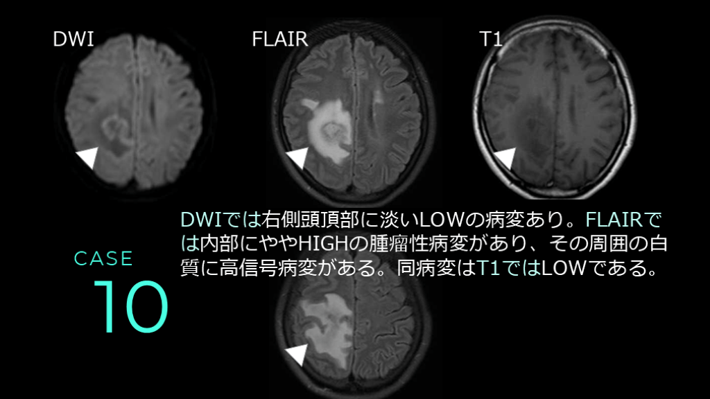 #74. 10 CASE DWIでは右側頭頂部に淡いLOWの病変あり。FLAIRでは内部にややHIGHの腫瘤性病変があり、その周囲の白質に高信号病変がある。同病変はT1ではLOWである。 DWI FLAIR T1
