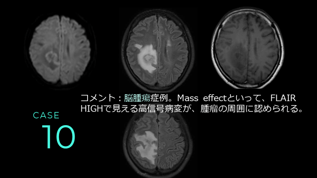 #75. 10 CASE コメント:脳腫瘍症例。Mass effectといって、FLAIR HIGHで見える高信号病変が、腫瘤の周囲に認められる。
