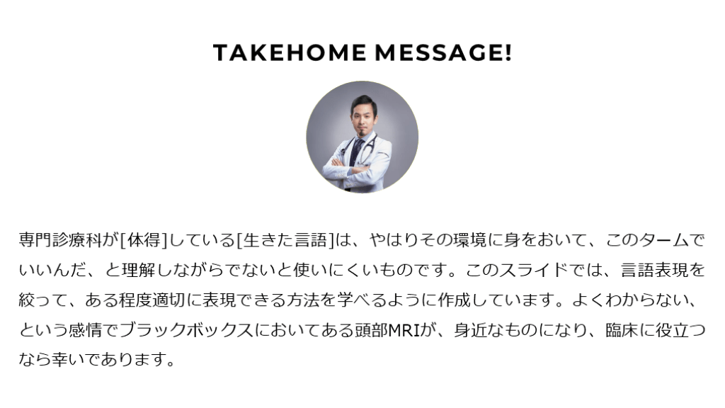 #76. 専門診療科が[体得]している[生きた言語]は、やはりその環境に身をおいて、このタームでいいんだ、と理解しながらでないと使いにくいものです。このスライドでは、言語表現を絞って、ある程度適切に表現できる方法を学べるように作成しています。よくわからない、という感情でブラックボックスにおいてある頭部MRIが、身近なものになり、臨床に役立つなら幸いであります。 TAKEHOME MESSAGE!