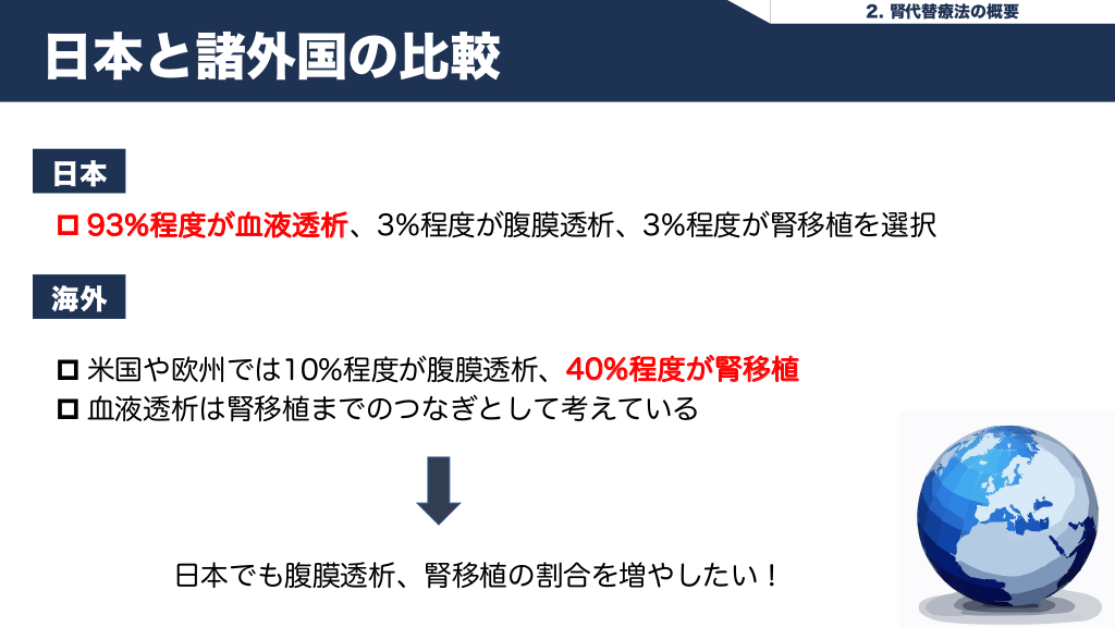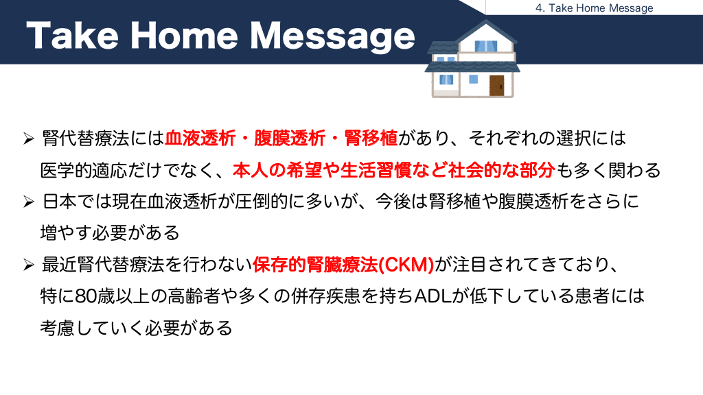 #23. 4. Take Home Message Take Home Message Ø 腎代替療法には血液透析・腹膜透析・腎移植があり、それぞれの選択には 医学的適応だけでなく、本人の希望や生活習慣など社会的な部分も多く関わる Ø 日本では現在血液透析が圧倒的に多いが、今後は腎移植や腹膜透析をさらに 増やす必要がある Ø 最近腎代替療法を行わない保存的腎臓療法(CKM)が注目されてきており、 特に80歳以上の高齢者や多くの併存疾患を持ちADLが低下している患者には 考慮していく必要がある