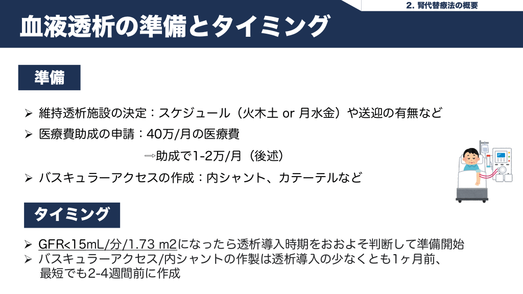 #11. 2. 腎代替療法の概要 血液透析の準備とタイミング 準備 Ø 維持透析施設の決定:スケジュール(火木土 or 月水金)や送迎の有無など Ø 医療費助成の申請:40万/月の医療費 ⇨助成で1-2万/月(後述) Ø バスキュラーアクセスの作成:内シャント、カテーテルなど タイミング Ø GFR<15mL/分/1.73 m2になったら透析導入時期をおおよそ判断して準備開始 Ø バスキュラーアクセス/内シャントの作製は透析導入の少なくとも1ヶ月前、 最短でも2-4週間前に作成