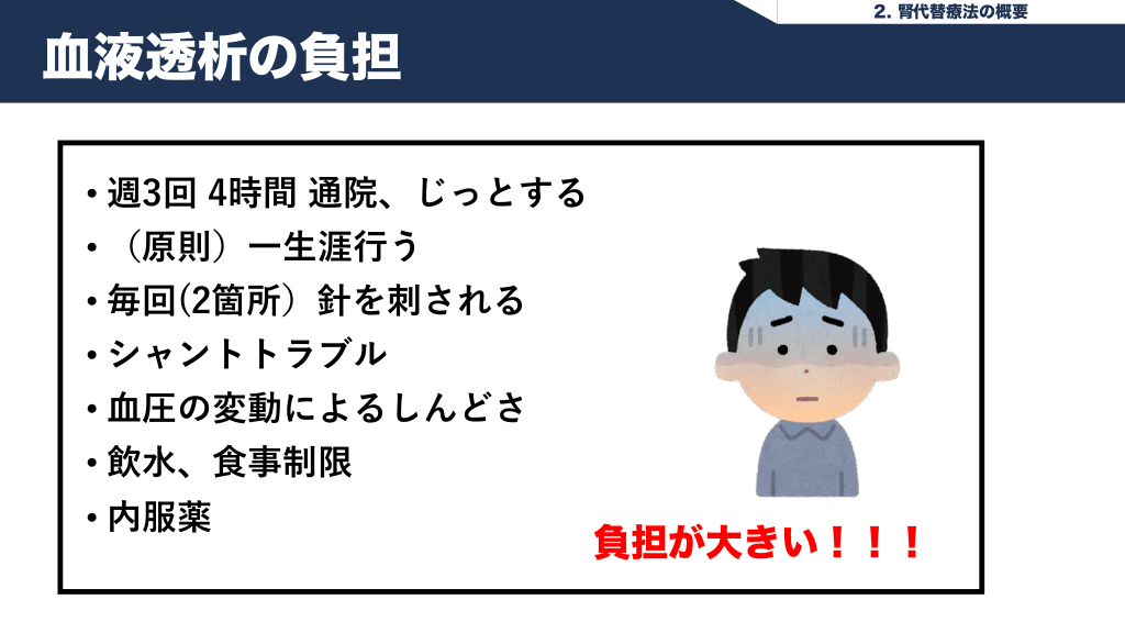 #12. 2. 腎代替療法の概要 血液透析の負担 • 週3回 4時間 通院、じっとする • (原則)⼀⽣涯⾏う • 毎回(2箇所)針を刺される • シャントトラブル • ⾎圧の変動によるしんどさ • 飲⽔、⾷事制限 • 内服薬 負担が大きい!!!