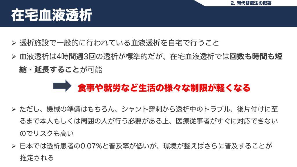 #13. 2. 腎代替療法の概要 在宅血液透析 Ø 透析施設で一般的に行われている血液透析を自宅で行うこと Ø 血液透析は4時間週3回の透析が標準的だが、在宅血液透析では回数も時間も短 縮・延長することが可能 食事や就労など生活の様々な制限が軽くなる Ø ただし、機械の準備はもちろん、シャント穿刺から透析中のトラブル、後片付けに至 るまで本人もしくは周囲の人が行う必要がある上、医療従事者がすぐに対応できない のでリスクも高い Ø 日本では透析患者の0.07%と普及率が低いが、環境が整えばさらに普及することが 推定される