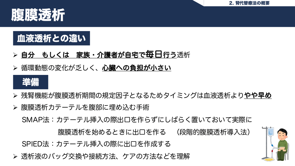 #14. 2. 腎代替療法の概要 腹膜透析 血液透析との違い Ø 自分 もしくは 家族・介護者が自宅で毎日行う透析 Ø 循環動態の変化が乏しく、心臓への負担が小さい 準備 Ø 残腎機能が腹膜透析期間の規定因子となるためタイミングは血液透析よりやや早め Ø 腹膜透析カテーテルを腹部に埋め込む手術 SMAP法:カテーテル挿入の際出口を作らずにしばらく置いておいて実際に 腹膜透析を始めるときに出口を作る (段階的腹膜透析導入法) SPIED法:カテーテル挿入の際に出口を作成する Ø 透析液のバッグ交換や接続方法、ケアの方法などを理解