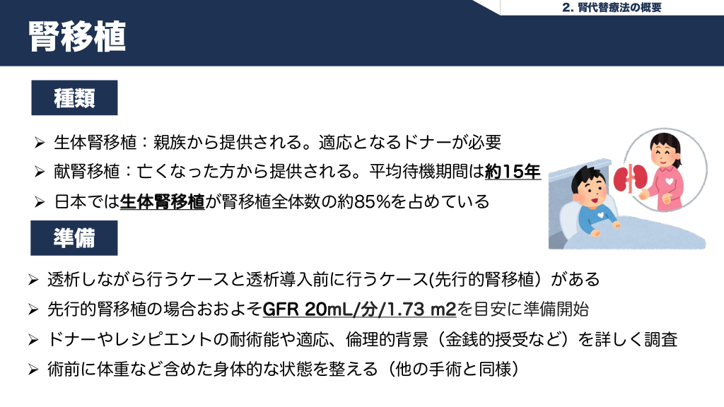 #15. 2. 腎代替療法の概要 腎移植 種類 Ø 生体腎移植:親族から提供される。適応となるドナーが必要 Ø 献腎移植:亡くなった方から提供される。平均待機期間は約15年 Ø 日本では生体腎移植が腎移植全体数の約85%を占めている 準備 Ø 透析しながら行うケースと透析導入前に行うケース(先行的腎移植)がある Ø 先行的腎移植の場合おおよそGFR 20mL/分/1.73 m2を目安に準備開始 Ø ドナーやレシピエントの耐術能や適応、倫理的背景(金銭的授受など)を詳しく調査 Ø 術前に体重など含めた身体的な状態を整える(他の手術と同様)