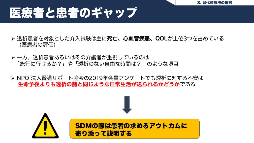 #18. 3. 腎代替療法の選択 医療者と患者のギャップ Ø 透析患者を対象とした介入試験は主に死亡、心血管疾患、QOLが上位3つを占めている (医療者の評価) Ø 一方,透析患者あるいはその介護者が重視しているのは 「旅行に行けるか?」や「透析のない自由な時間は?」のような項目 Ø NPO 法人腎臓サポート協会の2019年会員アンケートでも透析に対する不安は 生命予後よりも透析の前と同じような日常生活が送られるかどうかである SDMの際は患者の求めるアウトカムに 寄り添って説明する