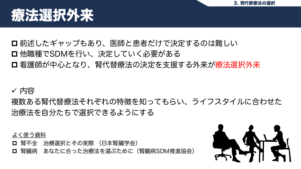 #19. 3. 腎代替療法の選択 療法選択外来 p 前述したギャップもあり、医師と患者だけで決定するのは難しい p 他職種でSDMを行い、決定していく必要がある p 看護師が中心となり、腎代替療法の決定を支援する外来が療法選択外来 ü 内容 複数ある腎代替療法それぞれの特徴を知ってもらい、ライフスタイルに合わせた 治療法を自分たちで選択できるようにする よく使う資料 p 腎不全 治療選択とその実際 (日本腎臓学会) p 腎臓病 あなたに合った治療法を選ぶために(腎臓病SDM推進協会)
