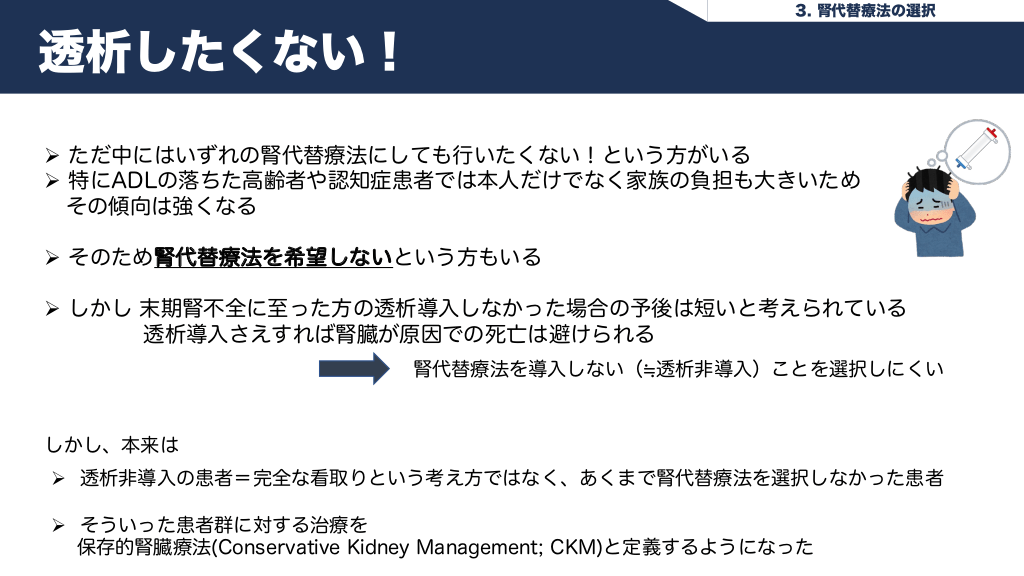 #20. 3. 腎代替療法の選択 透析したくない! Ø ただ中にはいずれの腎代替療法にしても行いたくない!という方がいる Ø 特にADLの落ちた高齢者や認知症患者では本人だけでなく家族の負担も大きいため その傾向は強くなる Ø そのため腎代替療法を希望しないという方もいる Ø しかし 末期腎不全に至った方の透析導入しなかった場合の予後は短いと考えられている 透析導入さえすれば腎臓が原因での死亡は避けられる 腎代替療法を導入しない( 透析非導入)ことを選択しにくい しかし、本来は Ø 透析非導入の患者=完全な看取りという考え方ではなく、あくまで腎代替療法を選択しなかった患者 Ø そういった患者群に対する治療を 保存的腎臓療法(Conservative Kidney Management; CKM)と定義するようになった