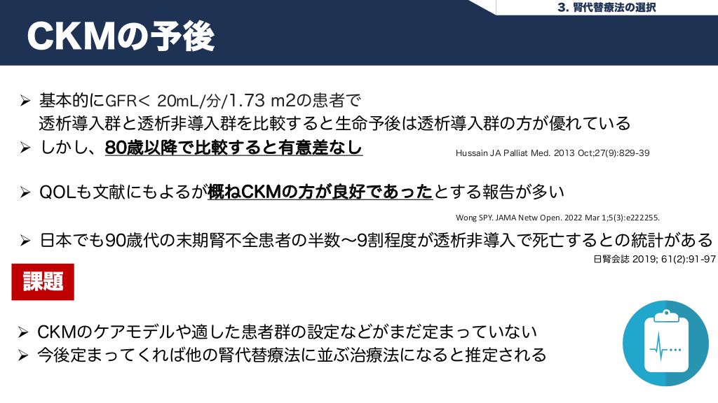 #22. 3. 腎代替療法の選択 CKMの予後 Ø 基本的にGFR< 20mL/分/1.73 m2の患者で 透析導入群と透析非導入群を比較すると生命予後は透析導入群の方が優れている Ø しかし、80歳以降で比較すると有意差なし Hussain JA Palliat Med. 2013 Oct;27(9):829-39 Ø QOLも文献にもよるが概ねCKMの方が良好であったとする報告が多い Wong SPY. JAMA Netw Open. 2022 Mar 1;5(3):e222255. Ø 日本でも90歳代の末期腎不全患者の半数〜9割程度が透析非導入で死亡するとの統計がある 日腎会誌 2019; 61(2):91-97 課題 Ø CKMのケアモデルや適した患者群の設定などがまだ定まっていない Ø 今後定まってくれば他の腎代替療法に並ぶ治療法になると推定される