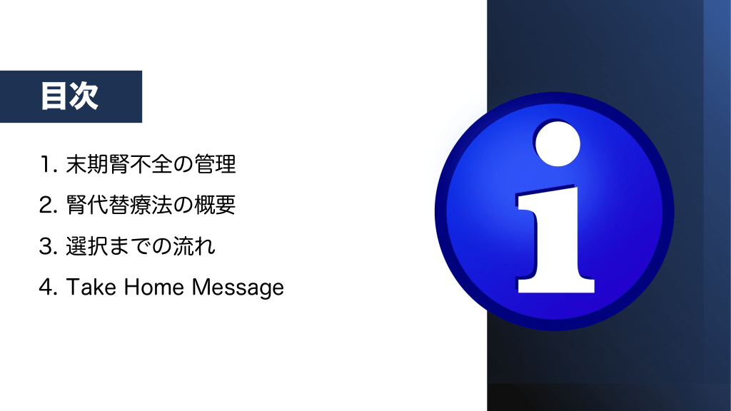 #3. 目次 1. 末期腎不全の管理 2. 腎代替療法の概要 3. 選択までの流れ 4. Take Home Message