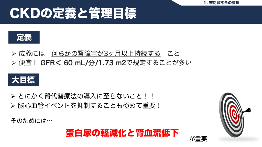 #4. 1. 末期腎不全の管理 CKDの定義と管理目標 定義 Ø 広義には 何らかの腎障害が3ヶ月以上持続する こと Ø 便宜上 GFR< 60 mL/分/1.73 m2で規定することが多い 大目標 Ø とにかく腎代替療法の導入に至らないこと!! Ø 脳心血管イベントを抑制することも極めて重要! そのためには… 蛋白尿の軽減化と腎血流低下 が重要