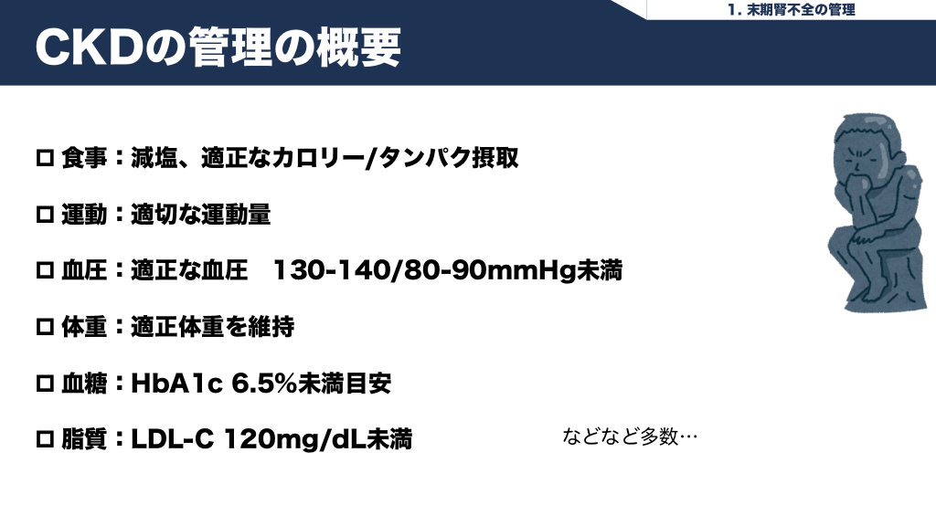 #5. 1. 末期腎不全の管理 CKDの管理の概要 p 食事:減塩、適正なカロリー/タンパク摂取 p 運動:適切な運動量 p 血圧:適正な血圧 130-140/80-90mmHg未満 p 体重:適正体重を維持 p 血糖:HbA1c 6.5%未満目安 p 脂質:LDL-C 120mg/dL未満 などなど多数…