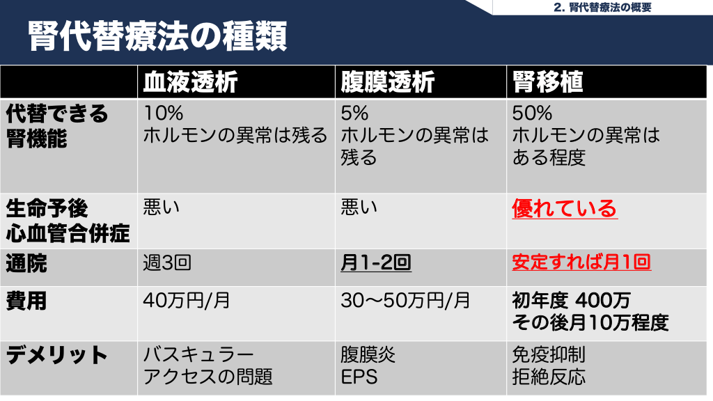 #8. 2. 腎代替療法の概要 腎代替療法の種類 血液透析 代替できる 腎機能 腹膜透析 10% 5% ホルモンの異常は残る ホルモンの異常は 残る 腎移植 50% ホルモンの異常は ある程度 悪い 生命予後 心血管合併症 週3回 通院 悪い 優れている 月1-2回 安定すれば月1回 費用 40万円/月 30〜50万円/月 初年度 400万 その後月10万程度 デメリット バスキュラー アクセスの問題 腹膜炎 EPS 免疫抑制 拒絶反応