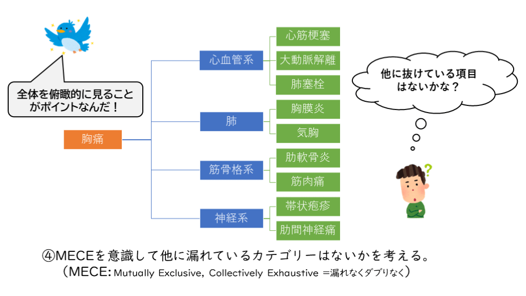 (MECE: Mutually Exclusive, Collectively Exhaustive =漏れなくダブりなく) 他に抜けている項目はないかな? 全体を俯瞰的に見ることがポイントなんだ!