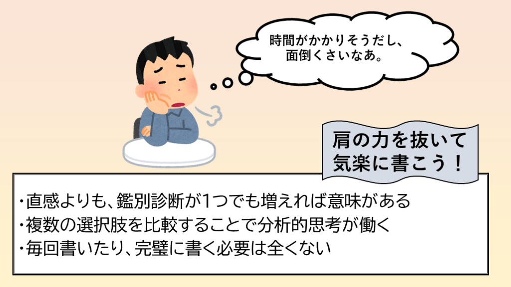 面倒くさいなあ。 ・直感よりも、鑑別診断が1つでも増えれば意味がある