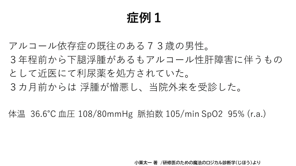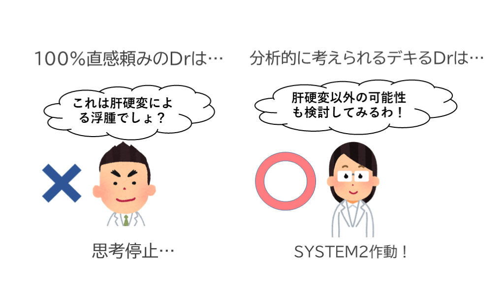 #22. 思考停止… これは肝硬変による浮腫でしょ? 思考停止… 分析的に考えられるデキるDrは… 肝硬変以外の可能性も検討してみるわ! 100%直感頼みのDrは… SYSTEM2作動!