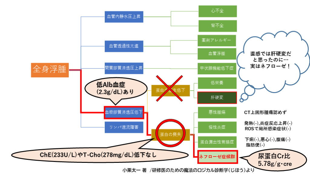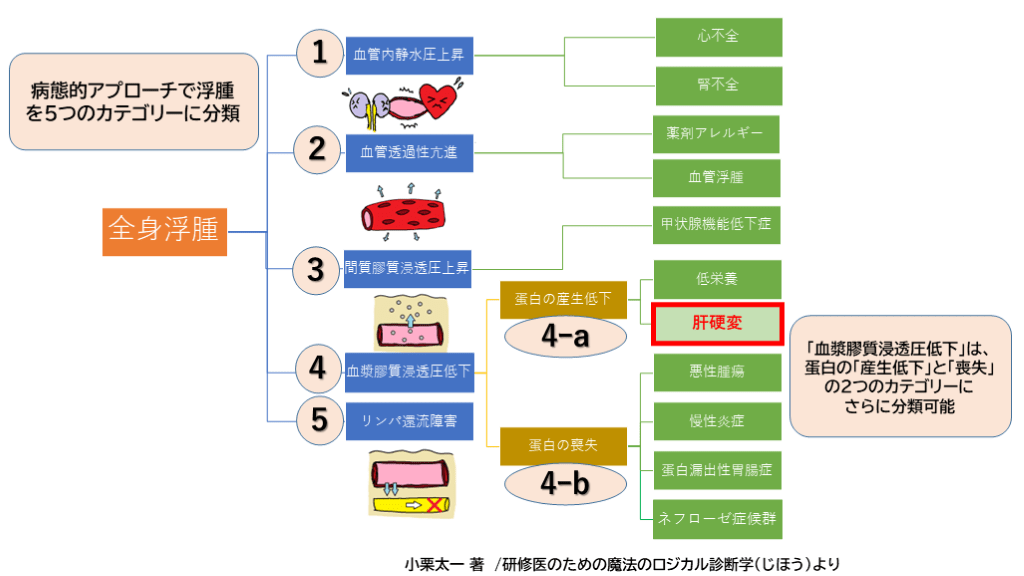 #23. 小栗太一 著 /研修医のための魔法のロジカル診断学(じほう)より 病態的アプローチで浮腫を5つのカテゴリーに分類 1 2 3 4 5 「血漿膠質浸透圧低下」は、蛋白の「産生低下」と「喪失」の2つのカテゴリーに