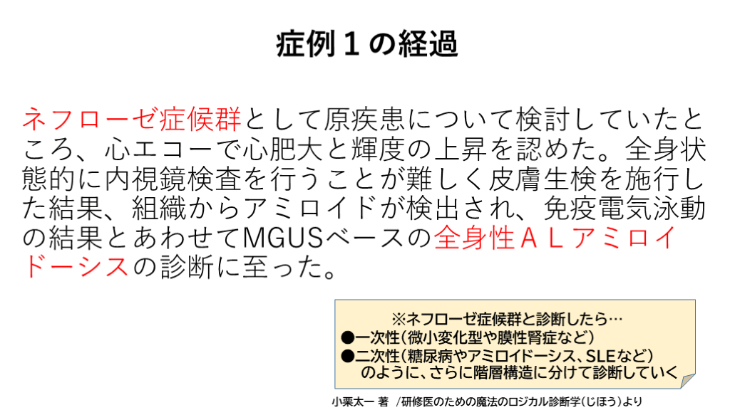ネフローゼ症候群として原疾患について検討していたところ、心エコーで心肥大と輝度の上昇を認めた。全身状態的に内視鏡検査を行うことが難しく皮膚生検を施行した結果、組織からアミロイドが検出され、免疫電気泳動の結果とあわせてMGUSベースの全身性ALアミロイドーシスの診断に至った。 小栗太一 著 /研修医のための魔法のロジカル診断学(じほう)より ※ネフローゼ症候群と診断したら…