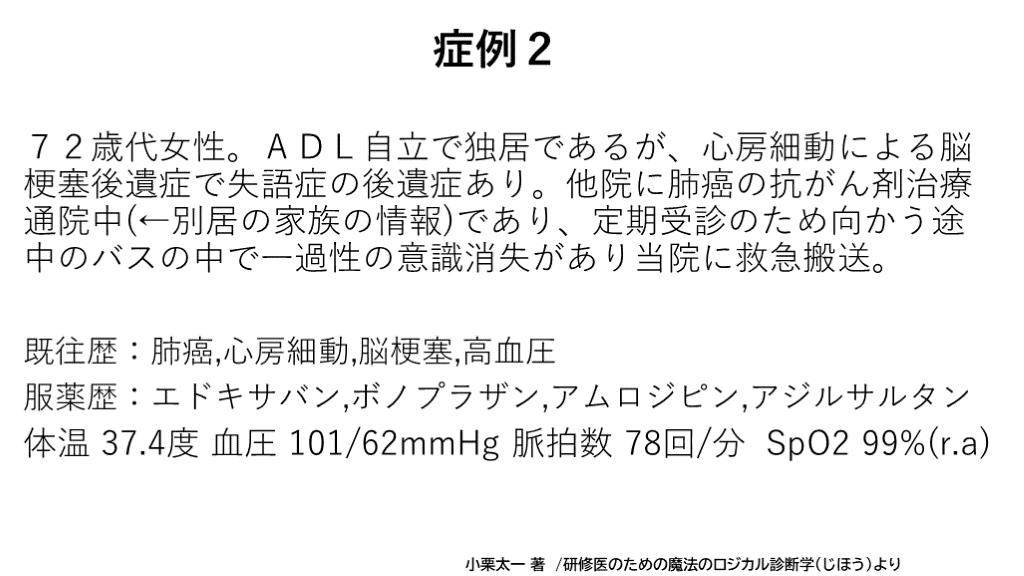 72歳代女性。ADL自立で独居であるが、心房細動による脳梗塞後遺症で失語症の後遺症あり。他院に肺癌の抗がん剤治療通院中(←別居の家族の情報)であり、定期受診のため向かう途中のバスの中で一過性の意識消失があり当院に救急搬送。