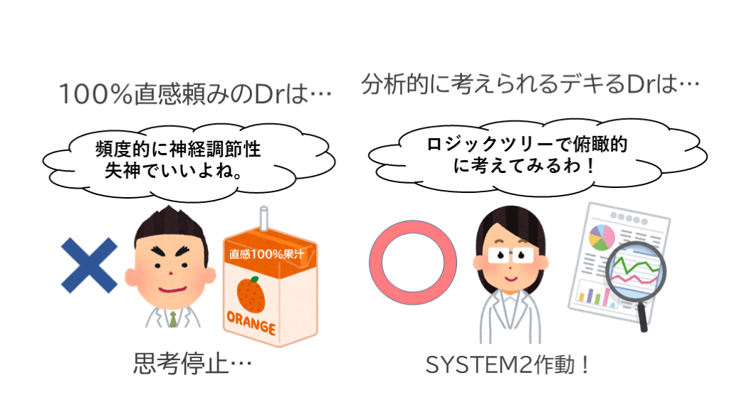 #27. 思考停止… 頻度的に神経調節性失神でいいよね。 思考停止… 分析的に考えられるデキるDrは… ロジックツリーで俯瞰的に考えてみるわ! SYSTEM2作動! 100%直感頼みのDrは… 直感100%果汁