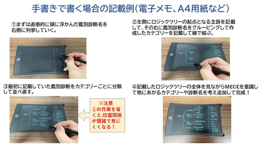 ②左側にロジックツリーの起点となる主訴を記載して、その右に鑑別診断名をグルーピングして作成したカテゴリーを記載して線で結ぶ。 ④記載したロジックツリーの全体を見ながらMECEを意識して他にあがるカテゴリーや診断名を考え追加して完成! ③最初に記載していた鑑別診断をカテゴリーごとに分類して並べ直す。 手書きで書く場合の記載例(電子メモ、A4用紙など)