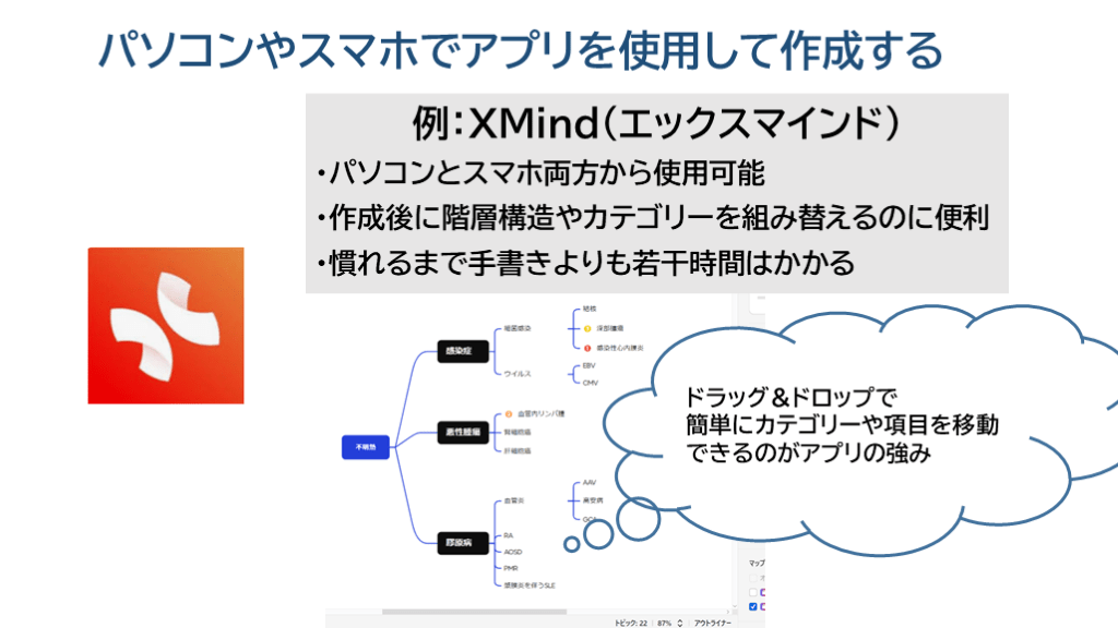 簡単にカテゴリーや項目を移動できるのがアプリの強み 例:XMind(エックスマインド)