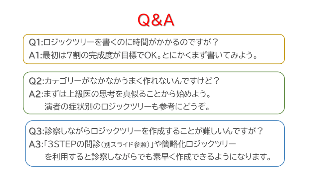 演者の症状別のロジックツリーも参考にどうぞ。 Q3:診察しながらロジックツリーを作成することが難しいんですが?