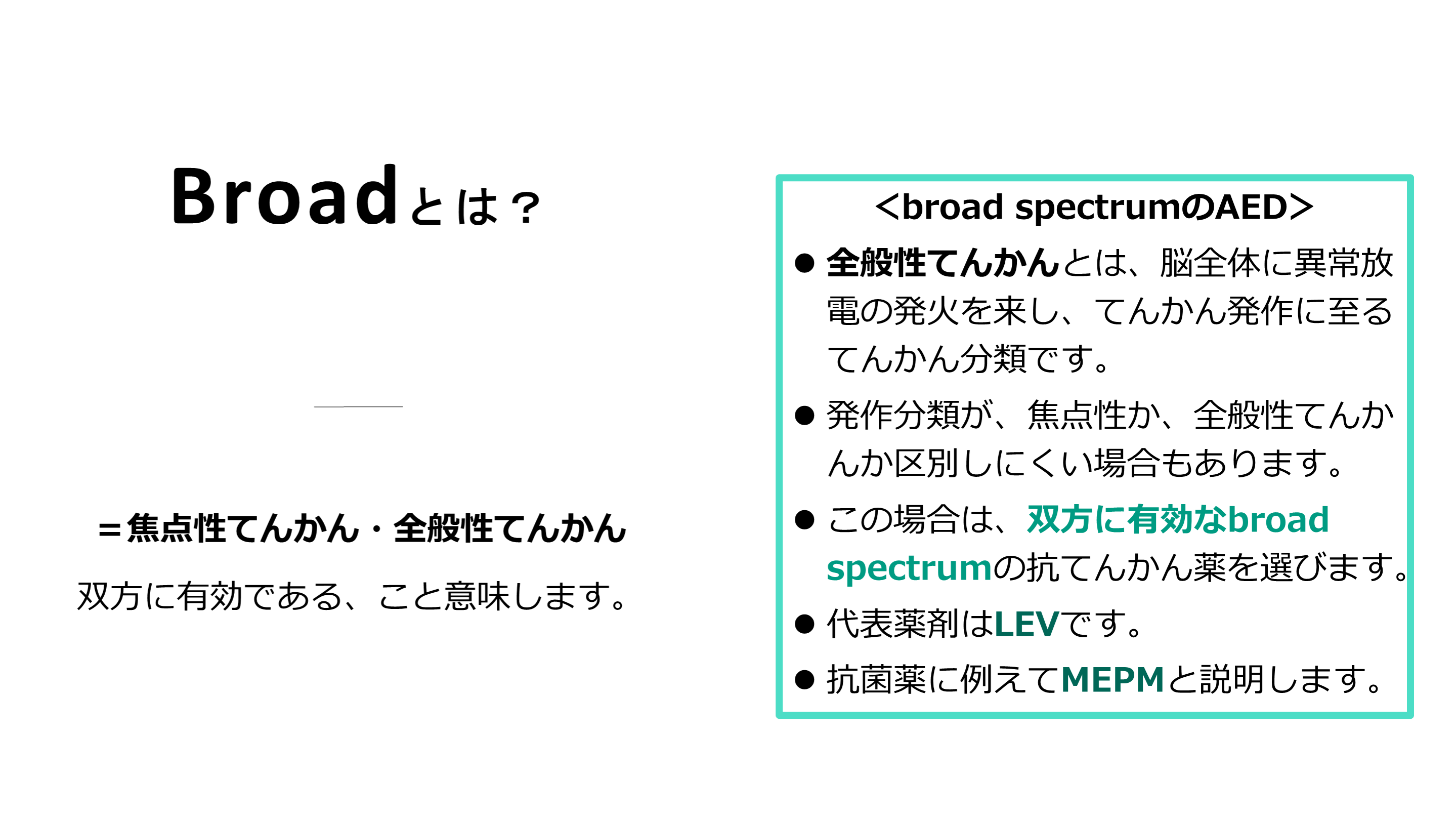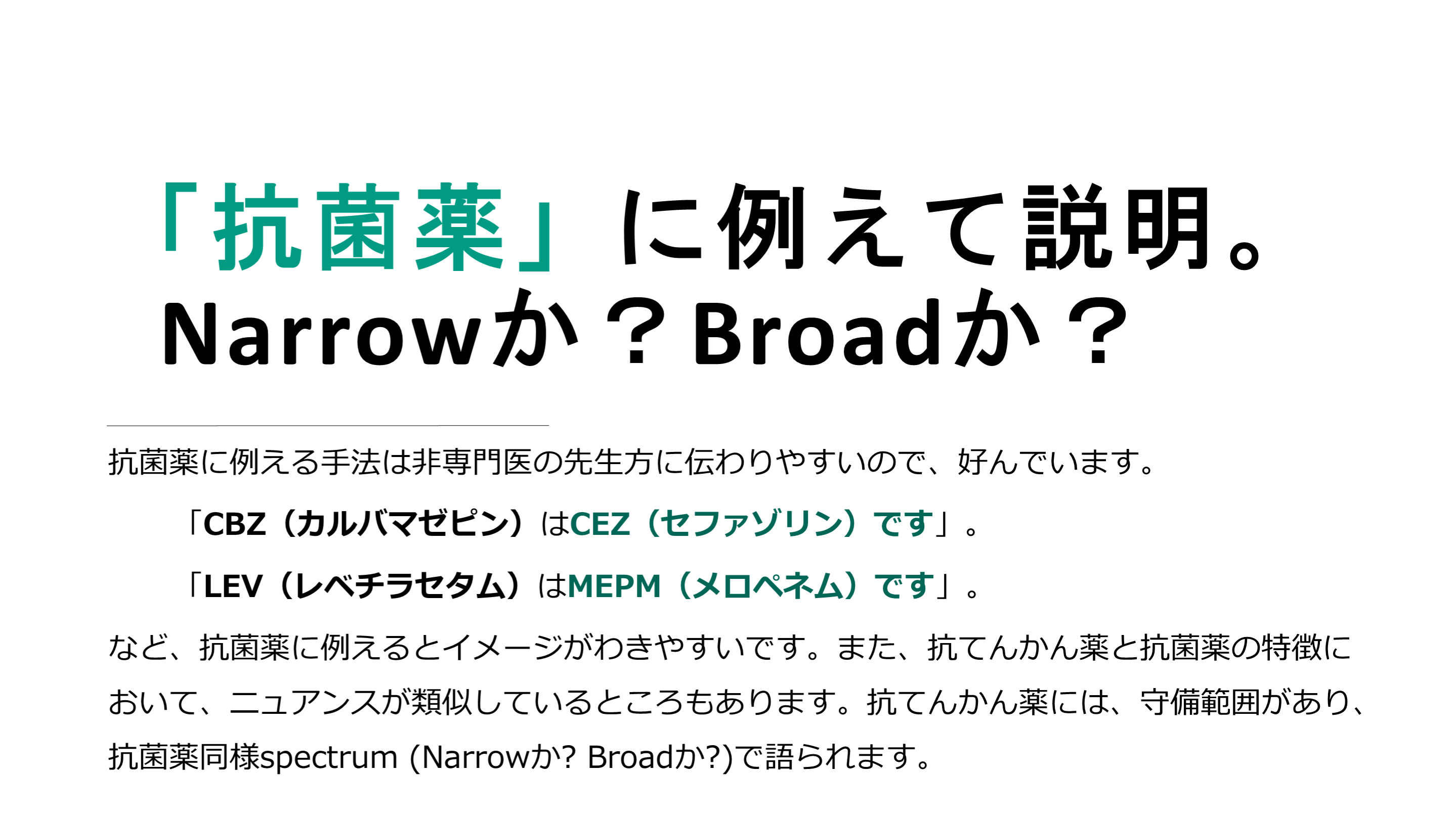 など、抗菌薬に例えるとイメージがわきやすいです。また、抗てんかん薬と抗菌薬の特徴において、ニュアンスが類似しているところもあります。抗てんかん薬には、守備範囲があり、抗菌薬同様spectrum (Narrowか? Broadか?)で語られます。