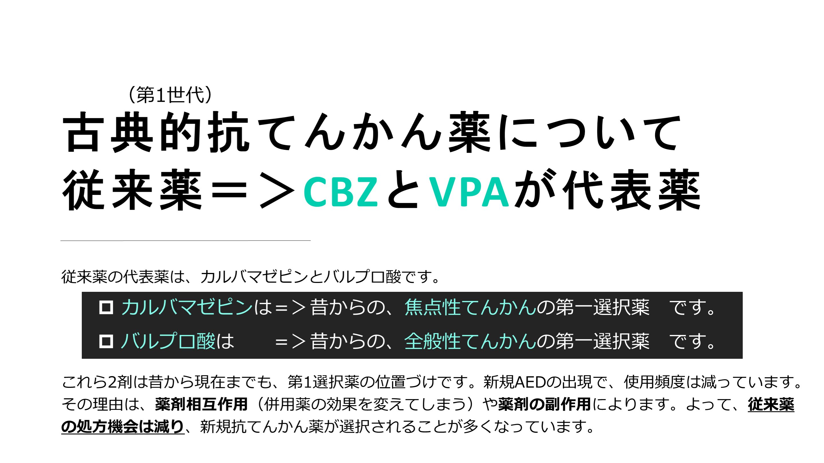 従来薬=>CBZとVPAが代表薬 従来薬の代表薬は、カルバマゼピンとバルプロ酸です。