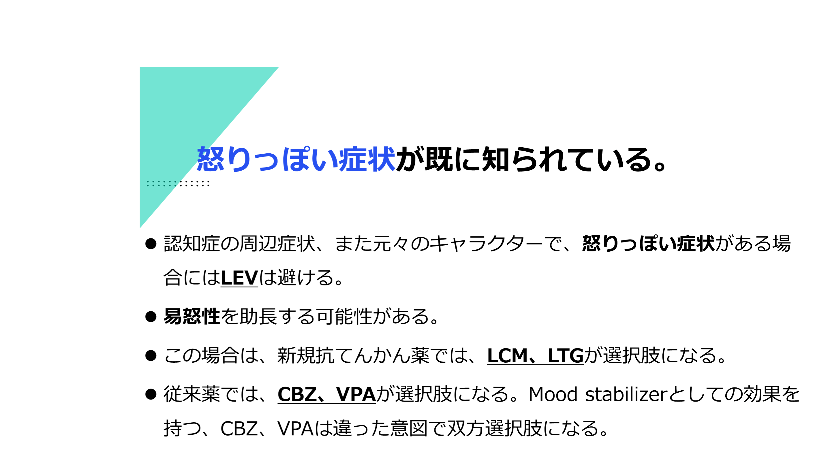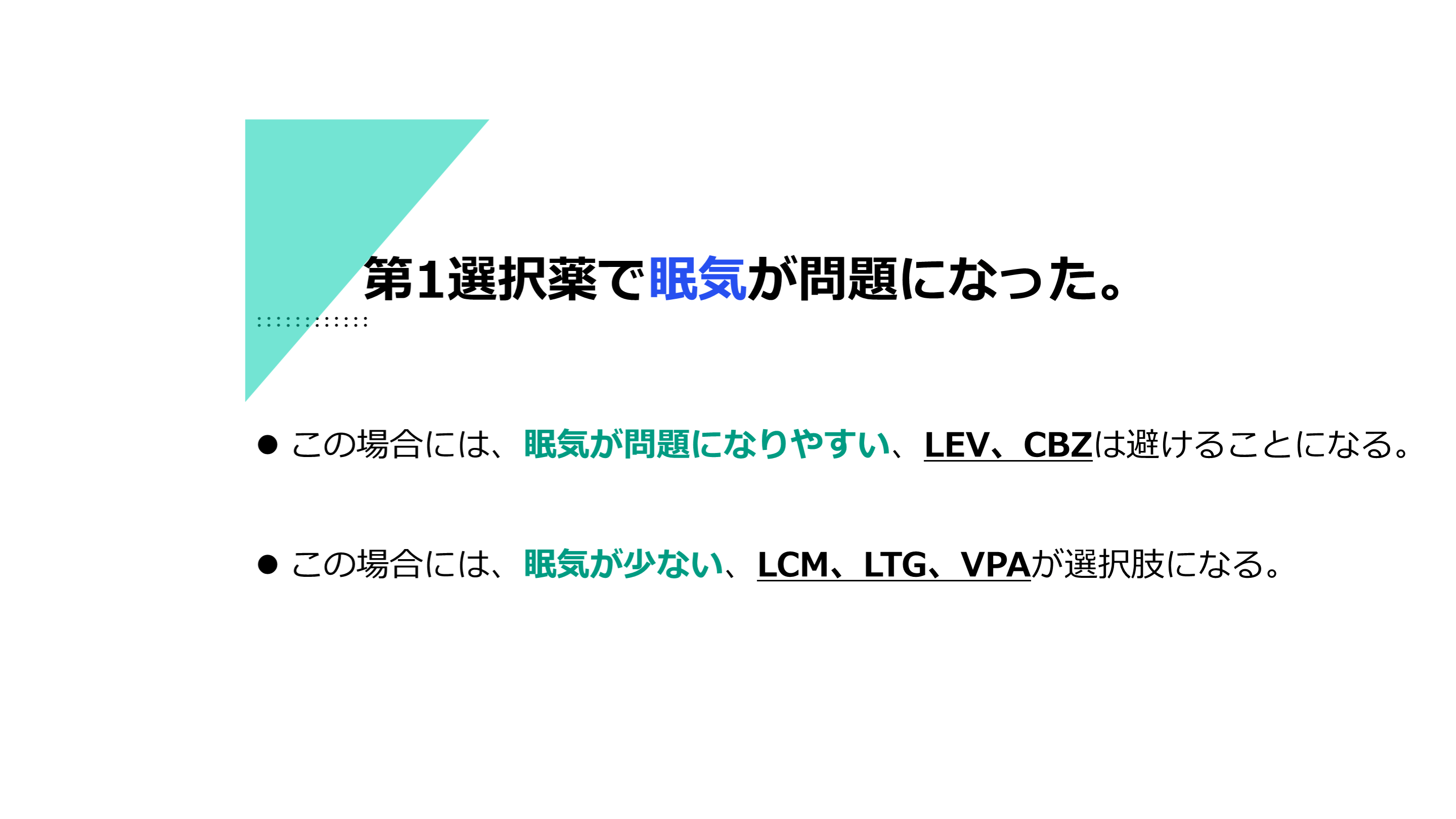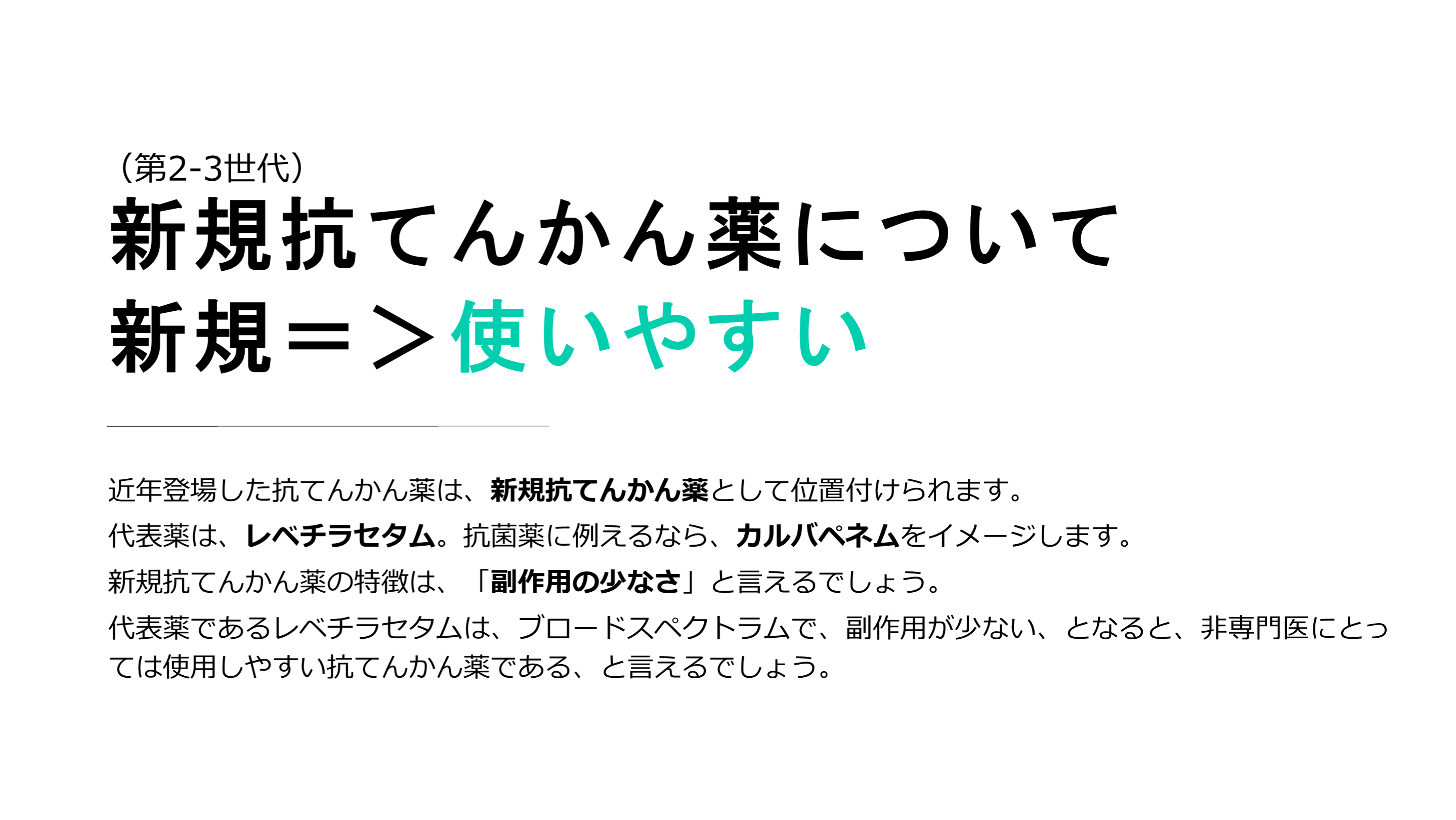 代表薬であるレベチラセタムは、ブロードスペクトラムで、副作用が少ない、となると、非専門医にとっては使用しやすい抗てんかん薬である、と言えるでしょう。 (第2-3世代)