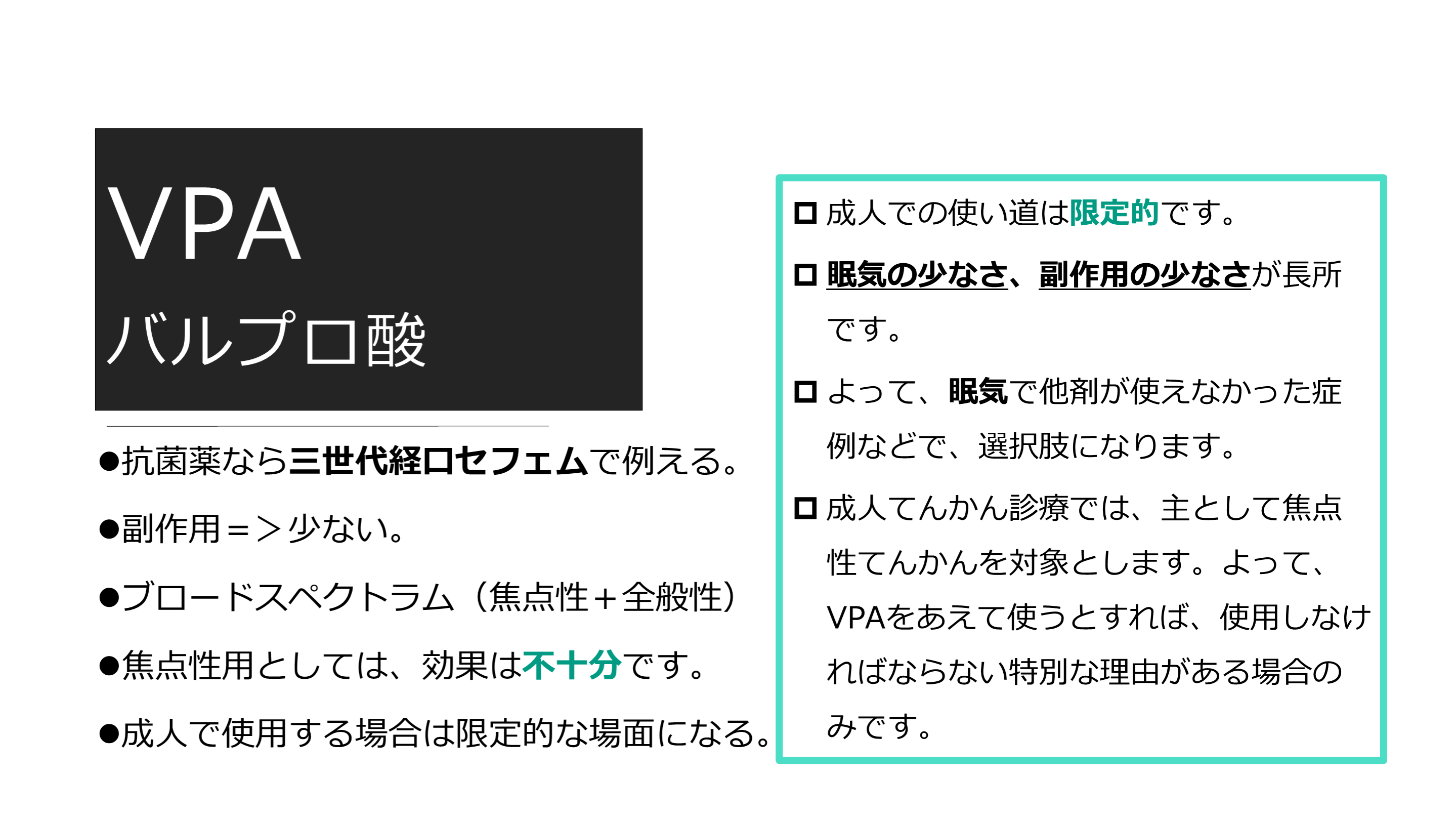 成人てんかん診療では、主として焦点性てんかんを対象とします。よって、VPAをあえて使うとすれば、使用しなければならない特別な理由がある場合のみです。