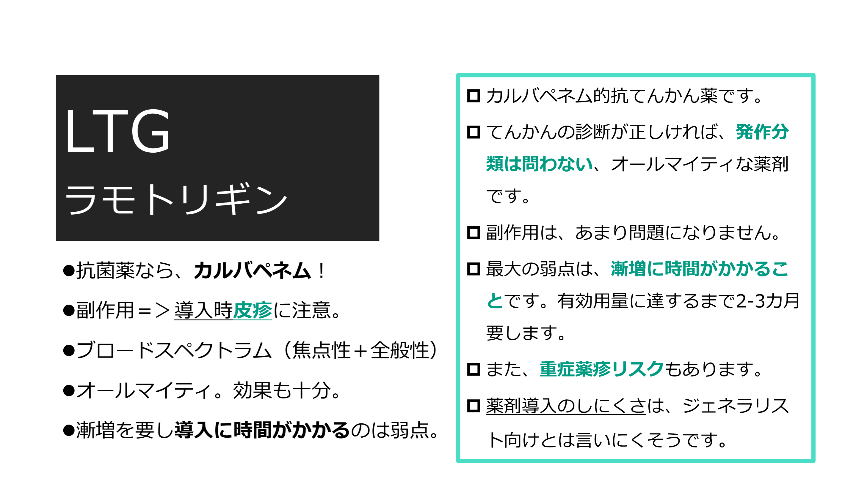 漸増を要し導入に時間がかかるのは弱点。 カルバペネム的抗てんかん薬です。