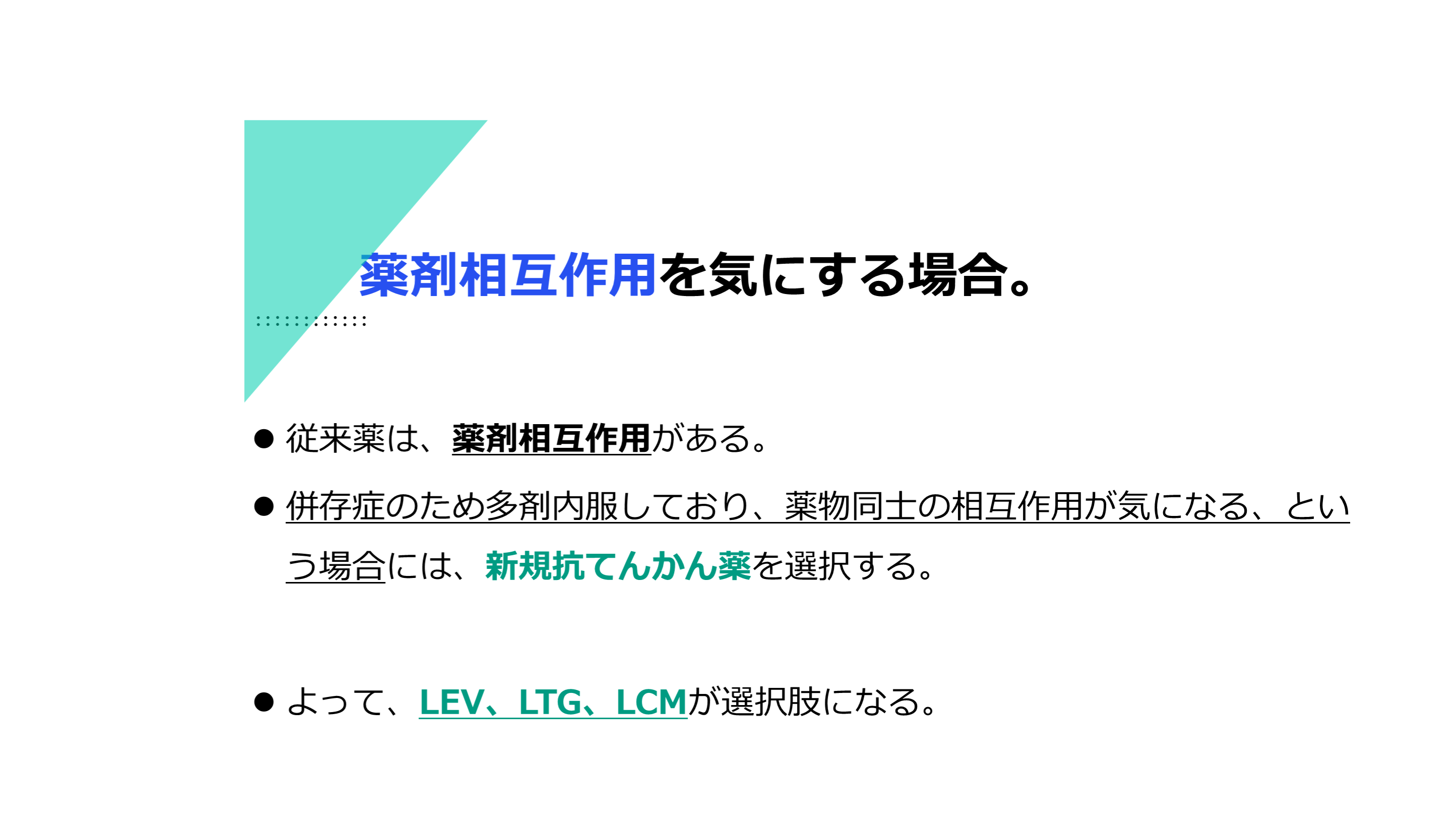 高齢発症であり、他剤併用薬もあり。新規AEDを選択する。