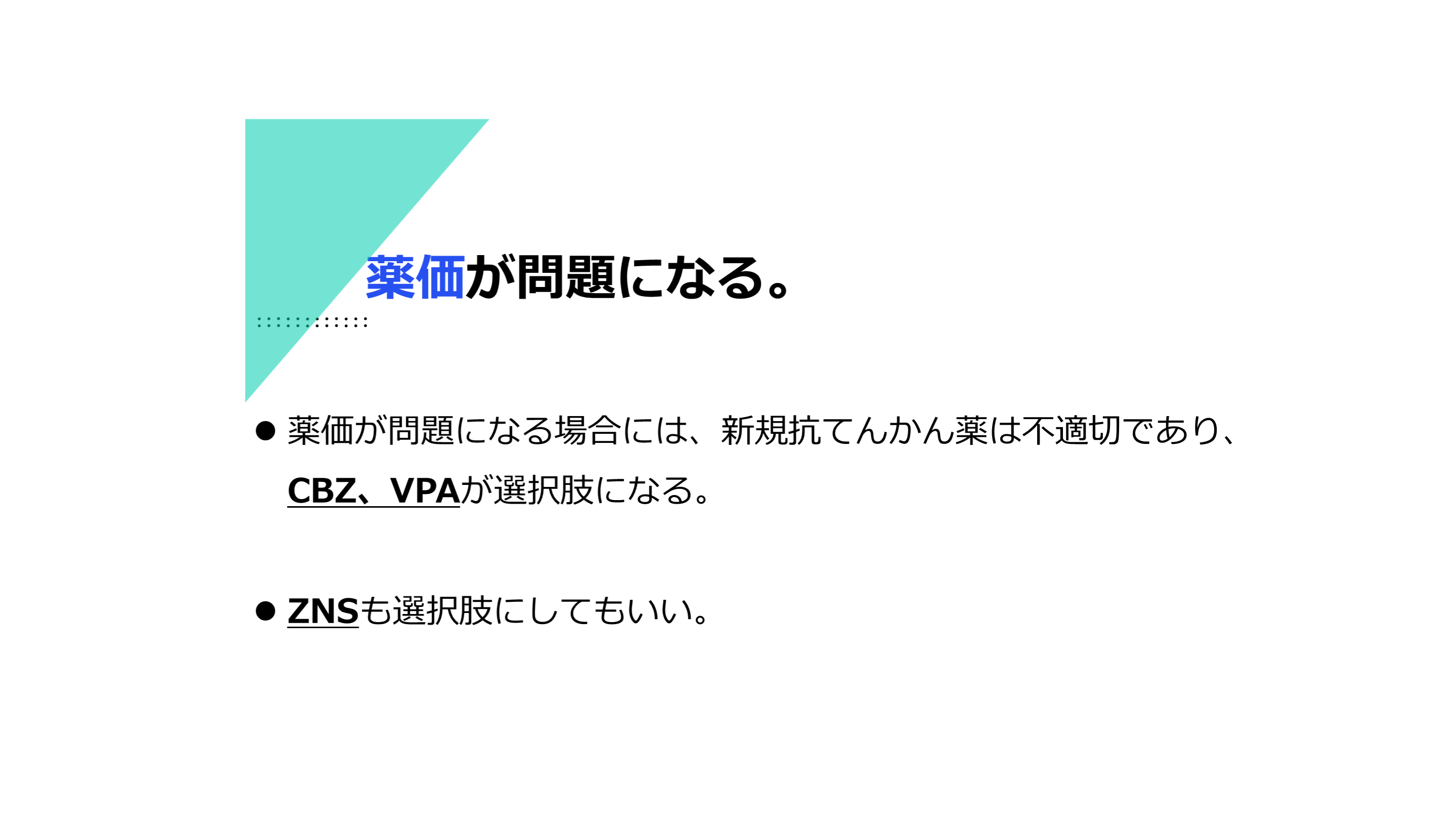コストが安いので、新規抗てんかん薬が使えない場合の代替薬として重宝します。