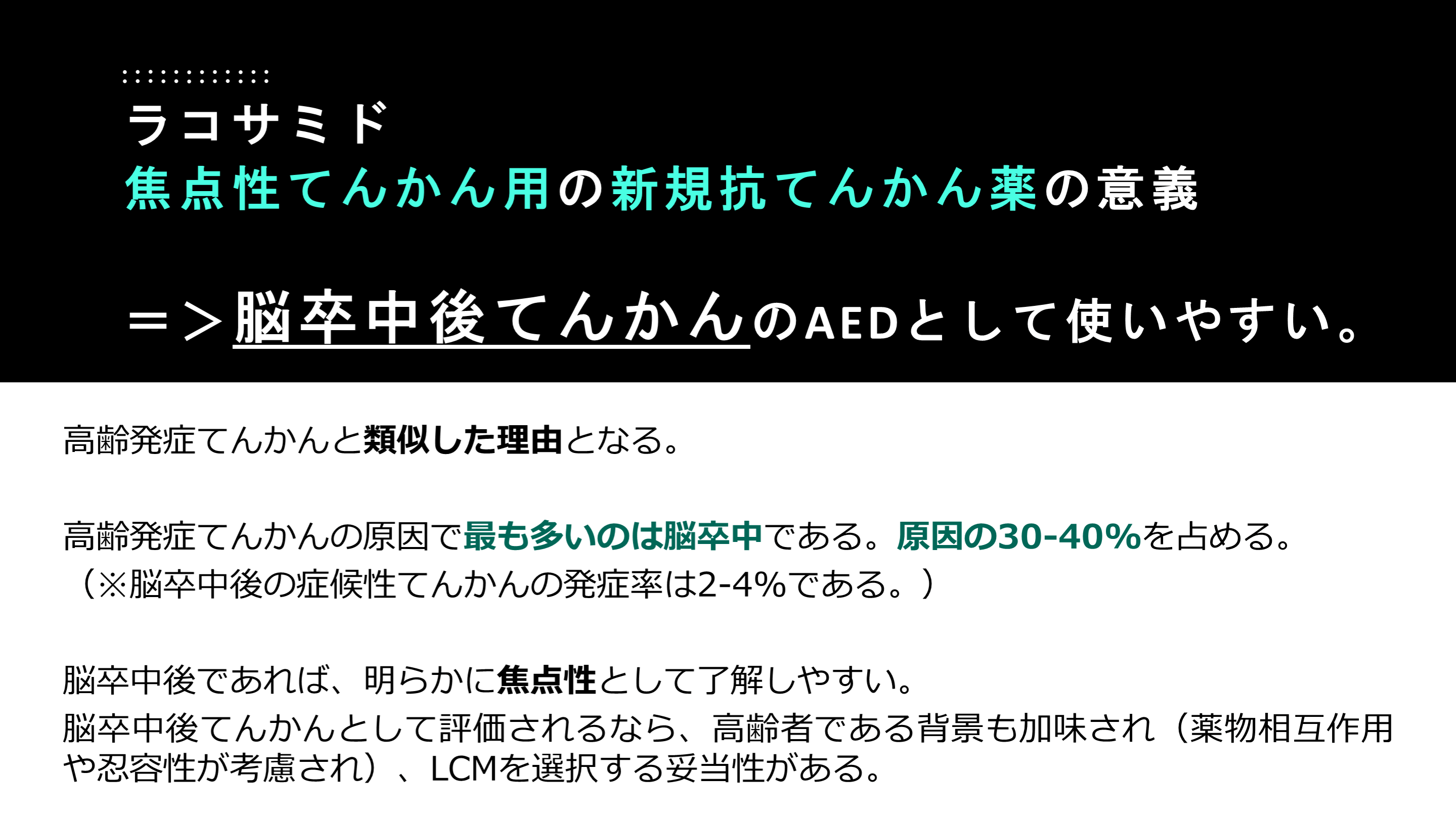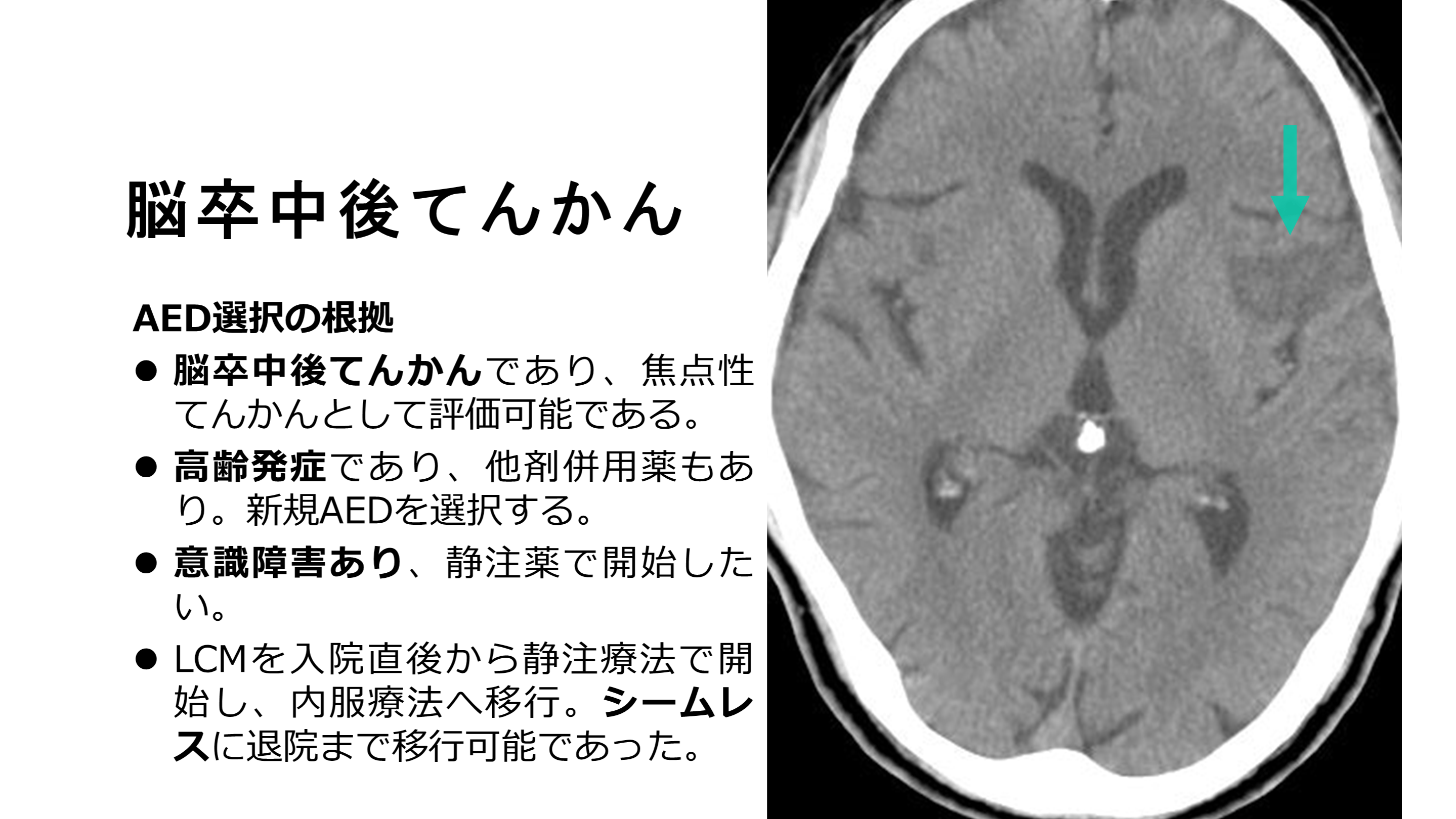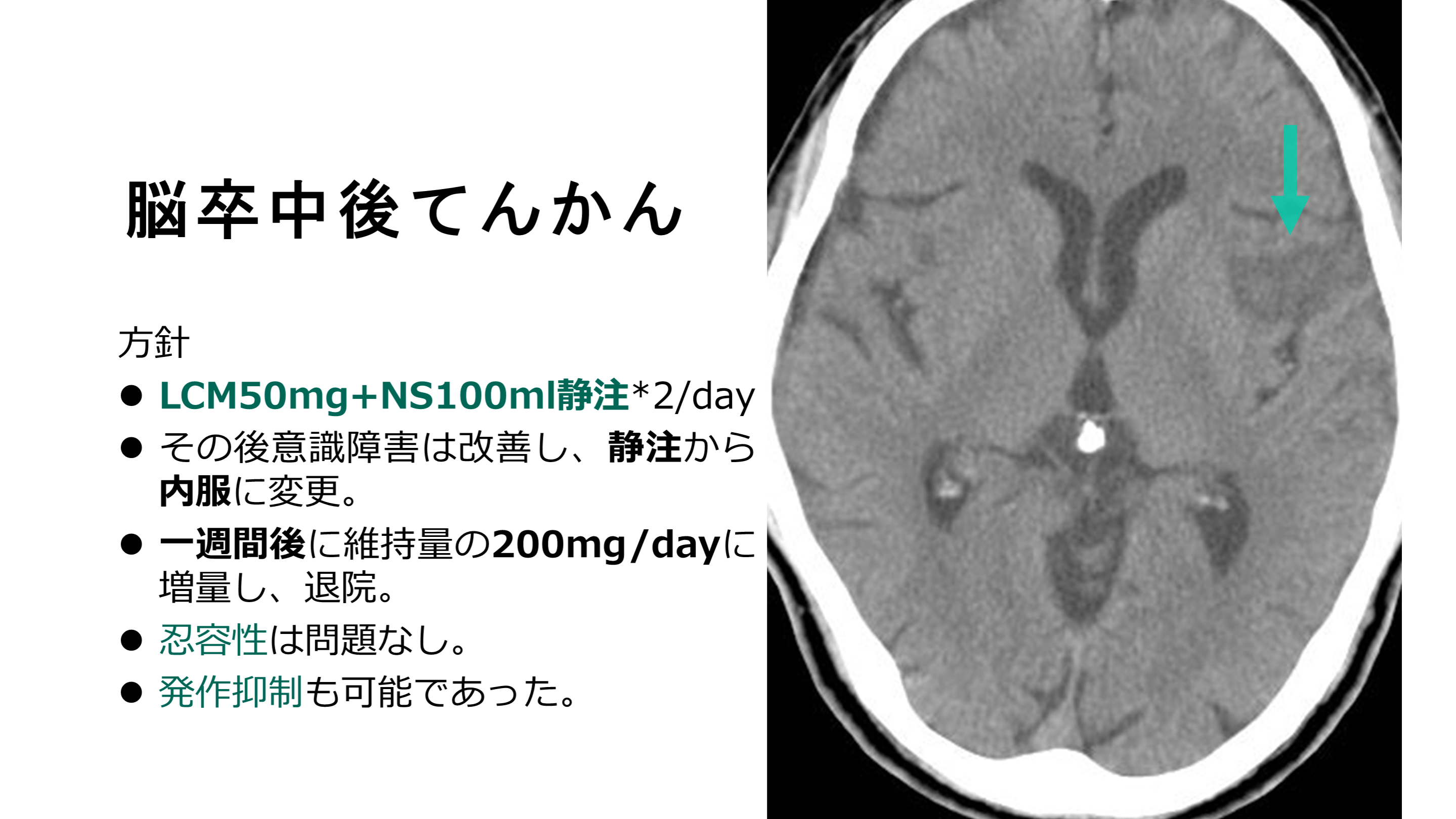LCMを入院直後から静注療法で開始し、内服療法へ移行。シームレスに退院まで移行可能であった。 脳卒中後てんかん