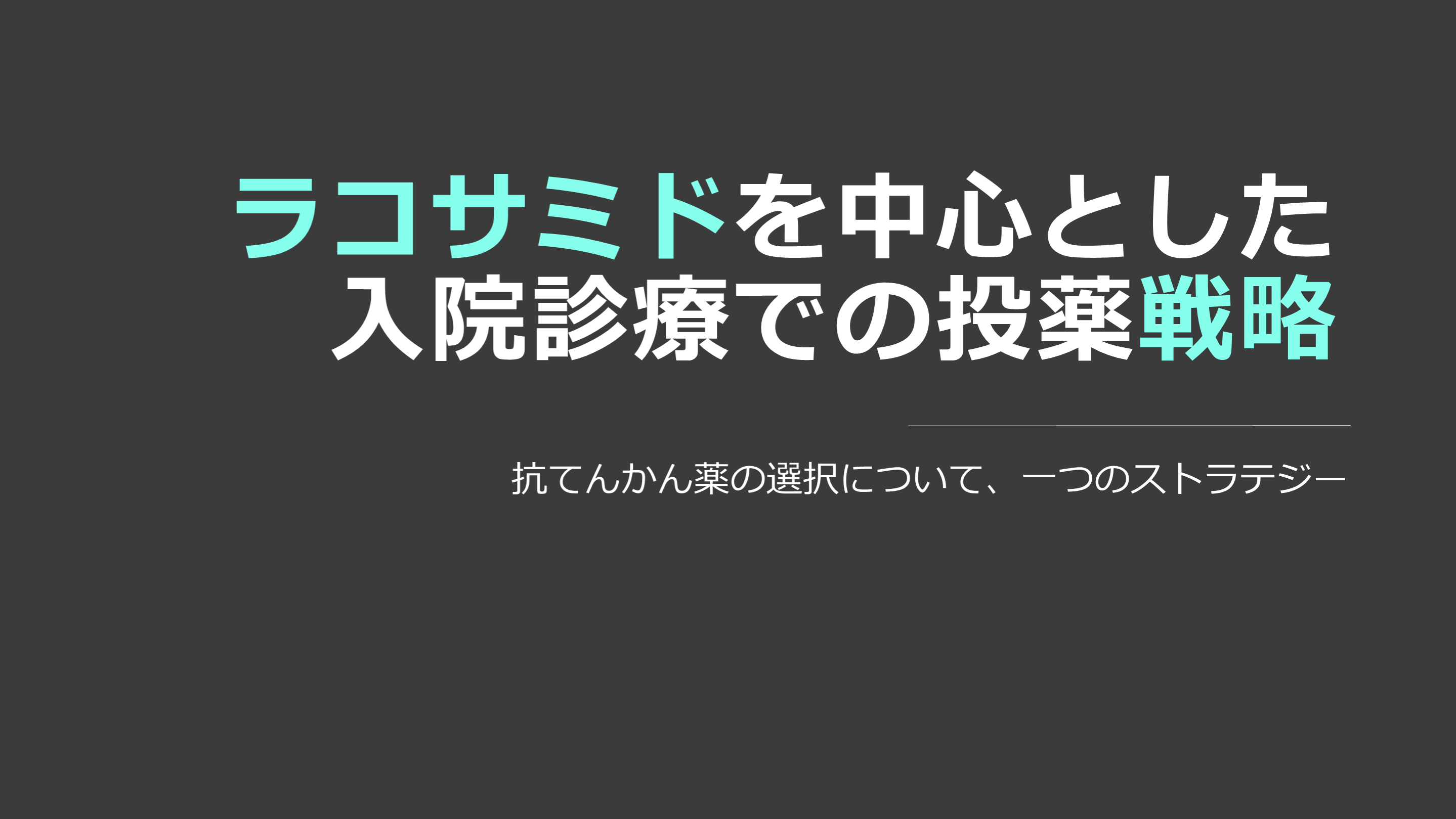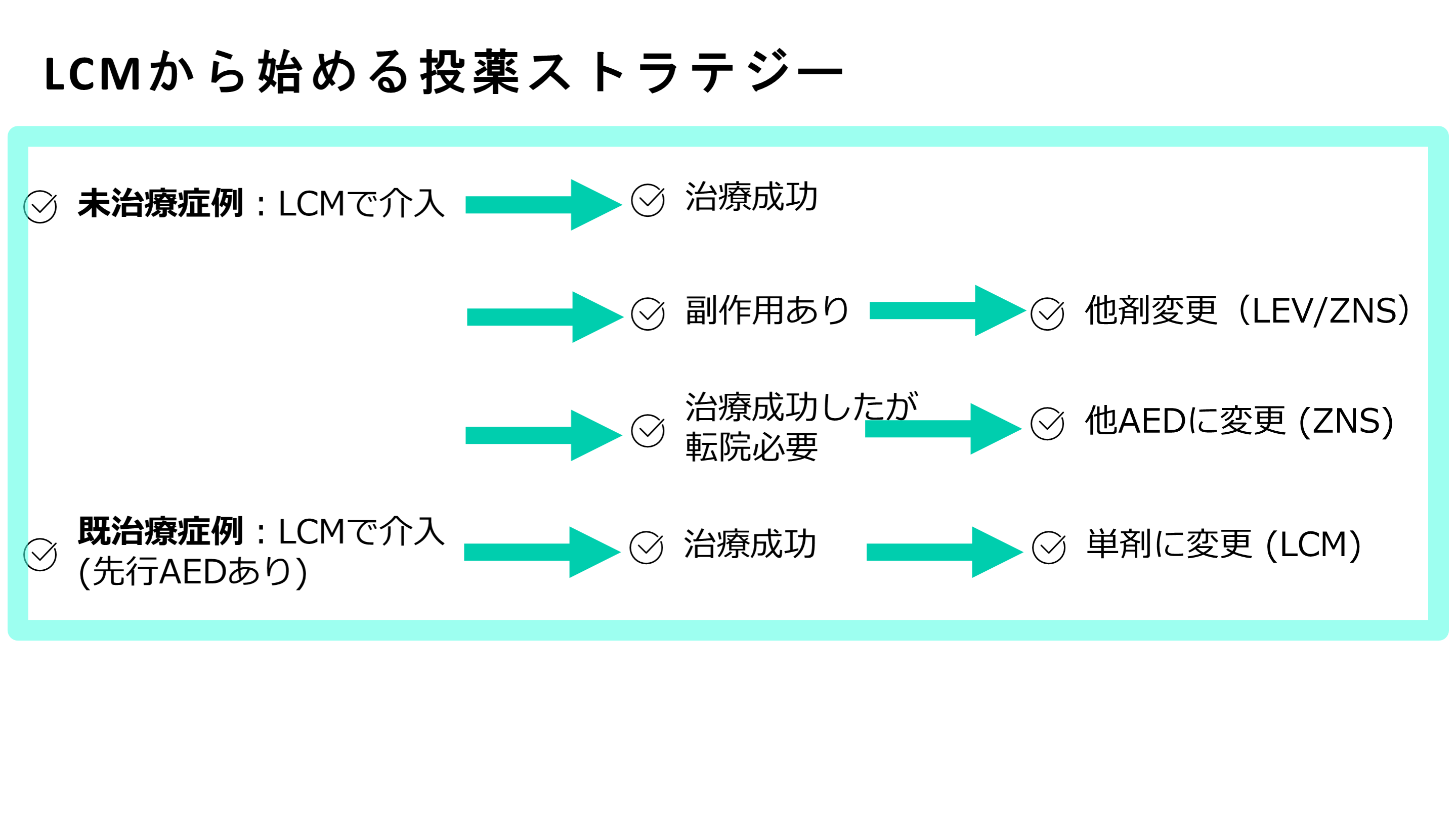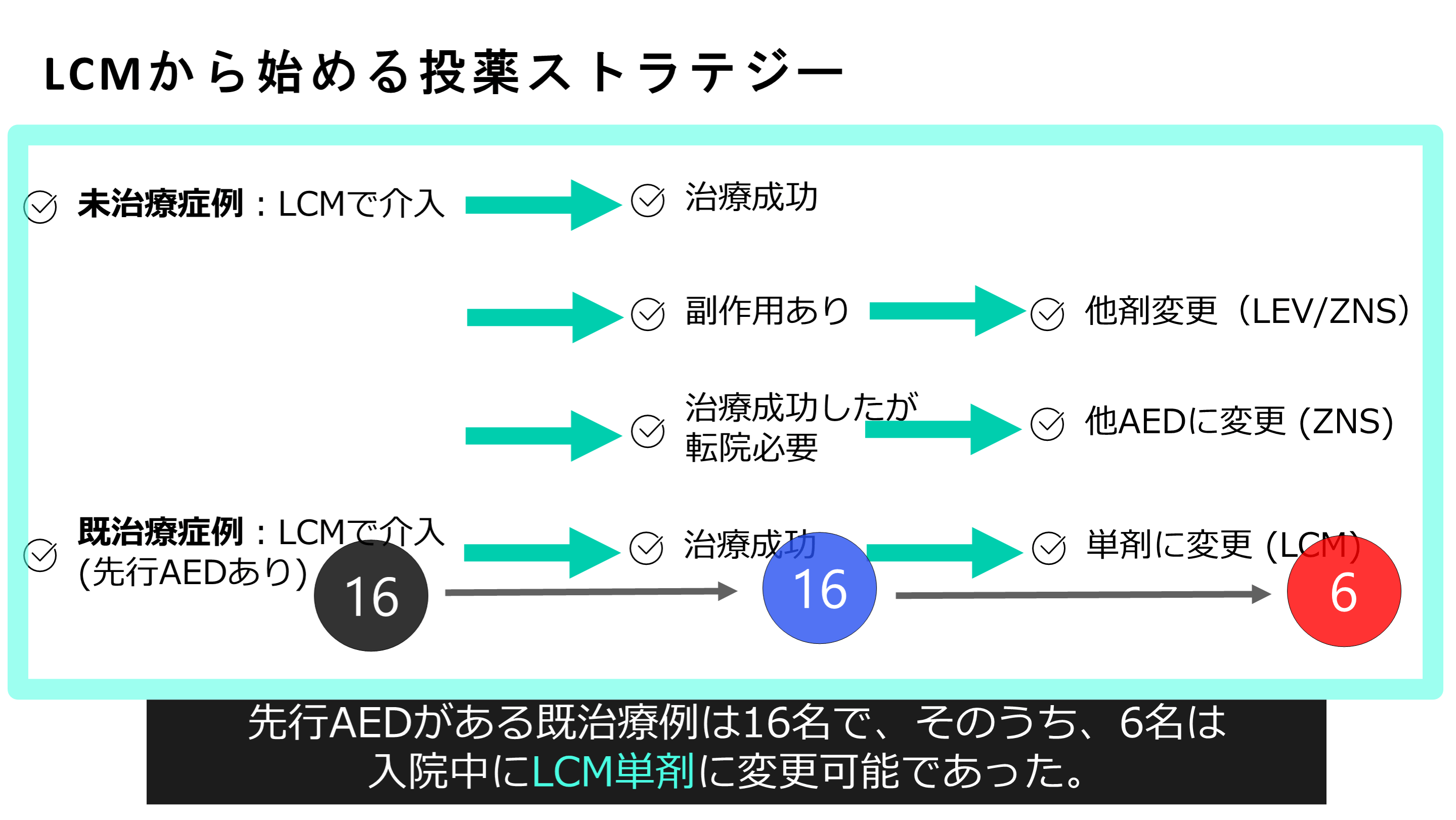 LCMを入院直後から静注療法で開始し、内服療法へ移行。シームレスに退院まで移行可能であった。 脳卒中後てんかん