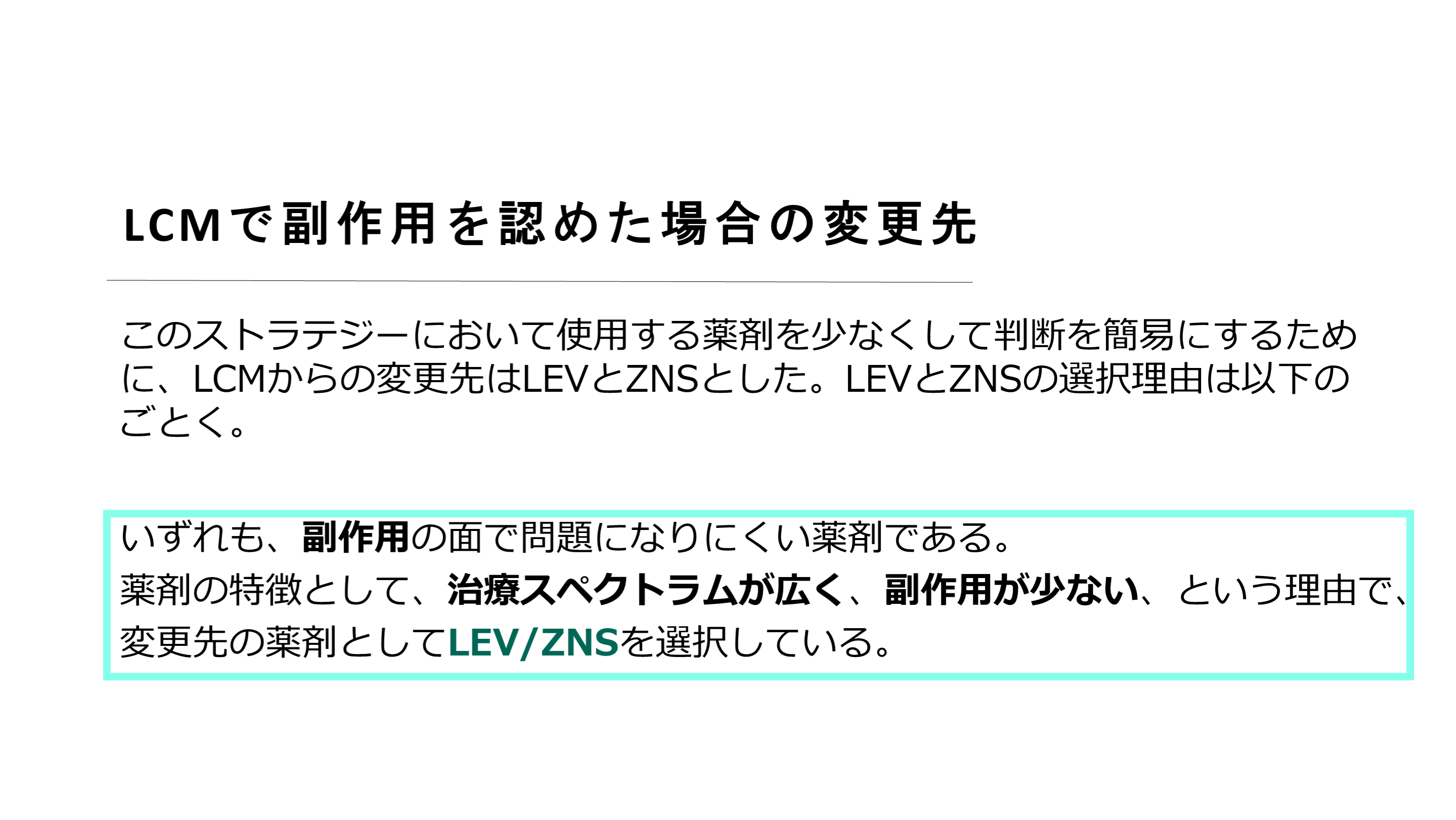 副作用で中止した5例以外は、LCMでの治療は有効であると評価した。 82
