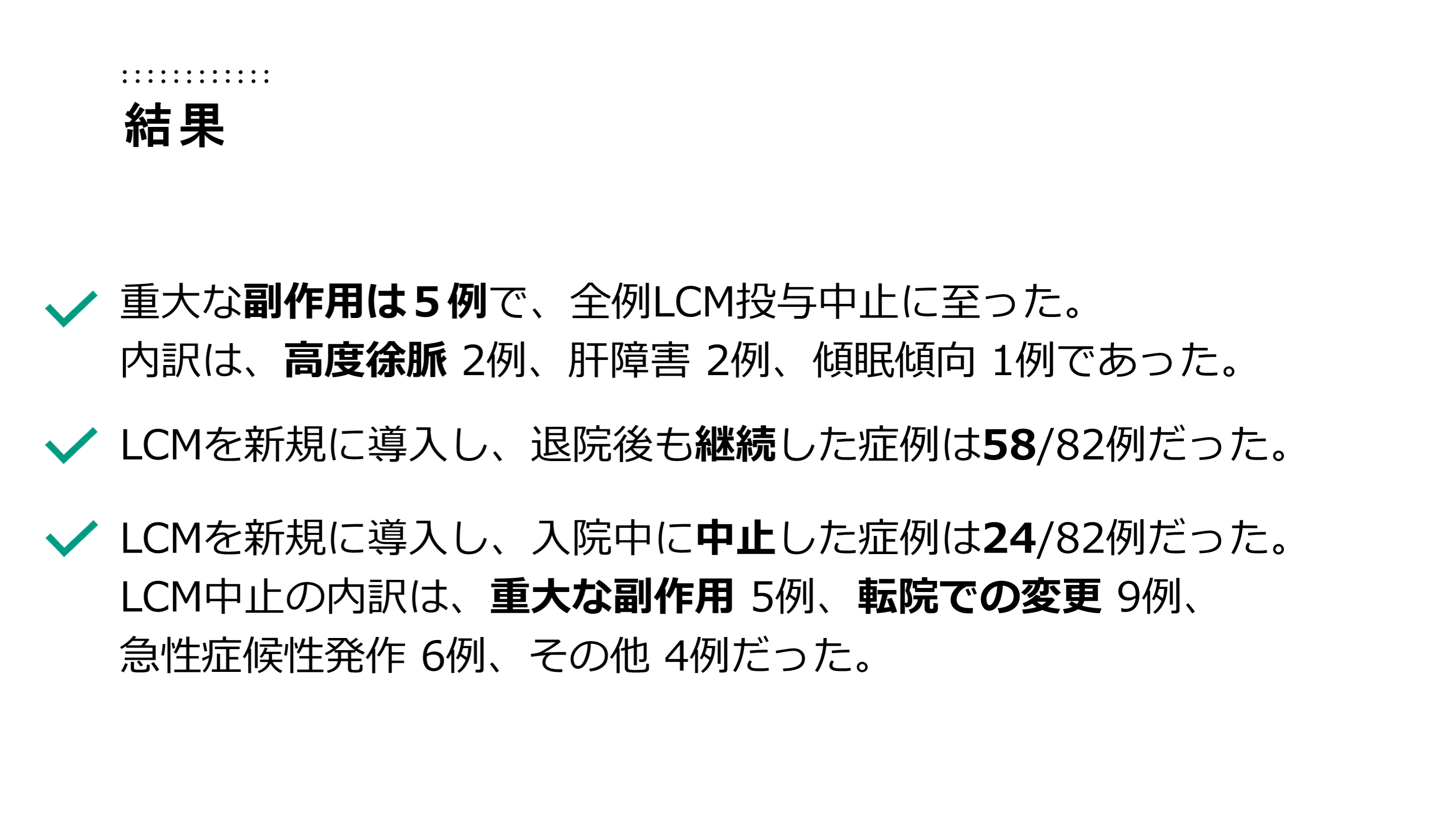 内訳は、高度徐脈 2例、肝障害 2例、傾眠傾向 1例であった。 LCMを新規に導入し、退院後も継続した症例は58/82例だった。 LCMを新規に導入し、入院中に中止した症例は24/82例だった。