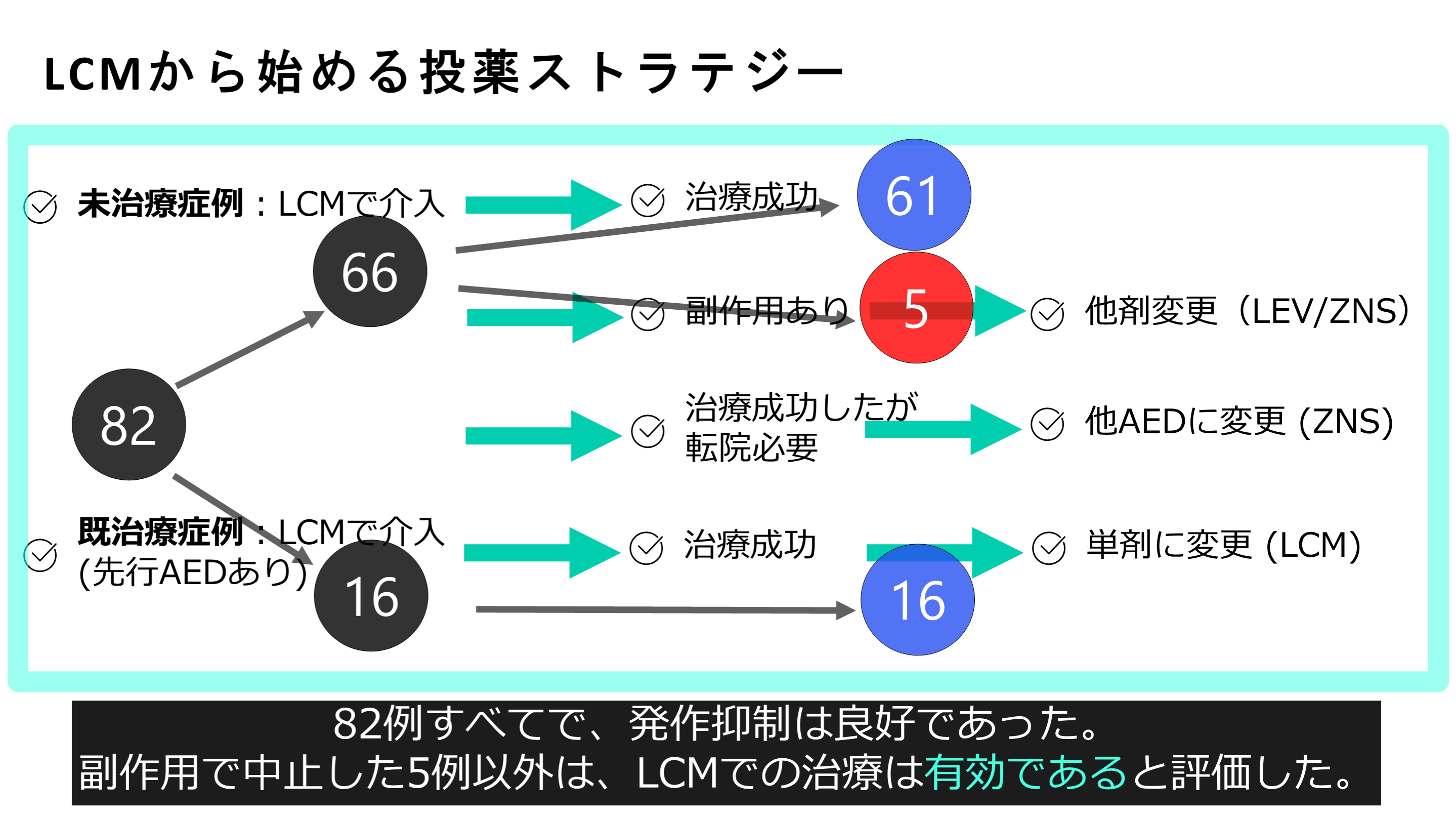 #59. LCMから始める投薬ストラテジー 66 61 5 16 16 82例すべてで、発作抑制は良好であった。