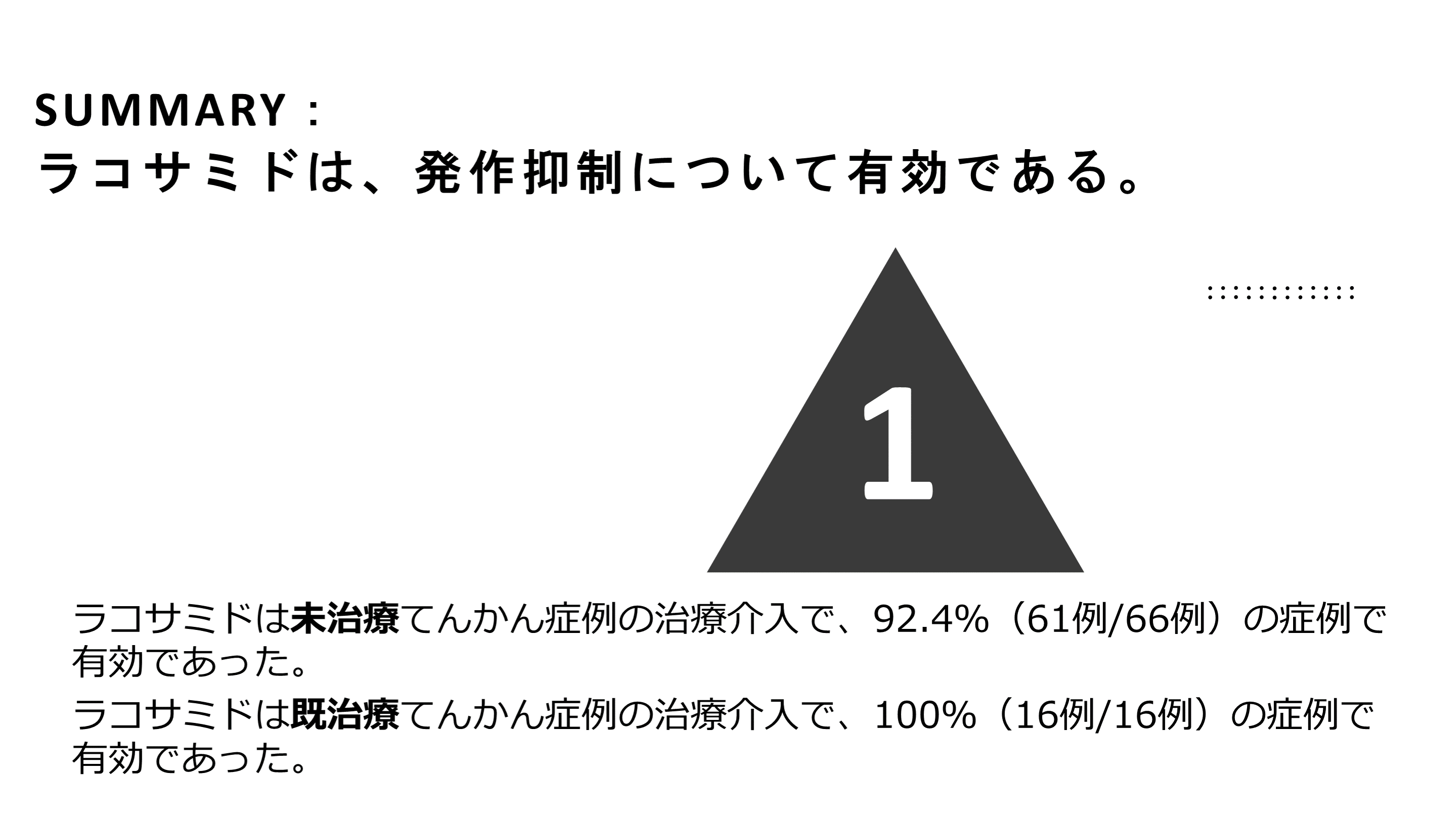 ラコサミドは既治療てんかん症例の治療介入で、100%(16例/16例)の症例で有効であった。 SUMMARY: