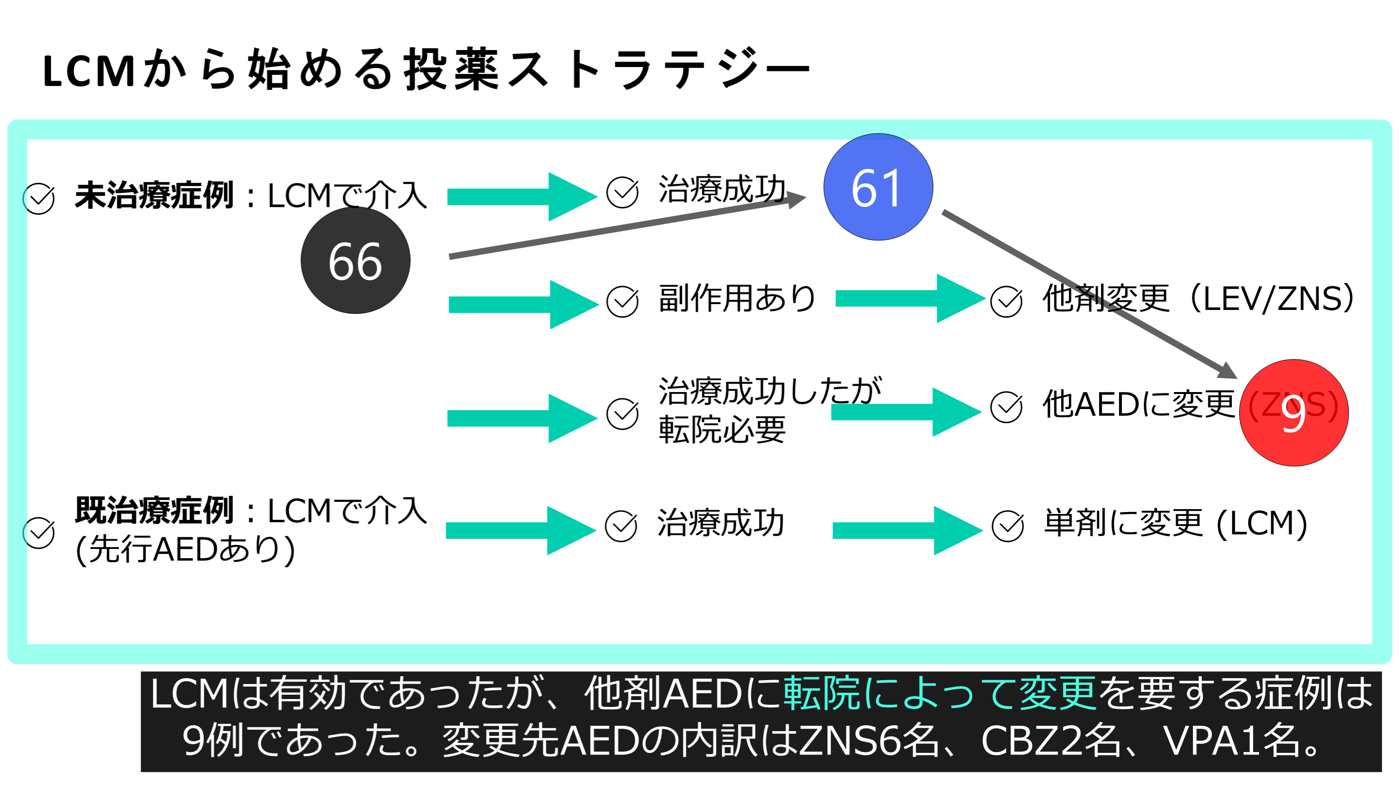#62. LCMから始める投薬ストラテジー 66 61 9 LCMは有効であったが、他剤AEDに転院によって変更を要する症例は9例であった。変更先AEDの内訳はZNS6名、CBZ2名、VPA1名。