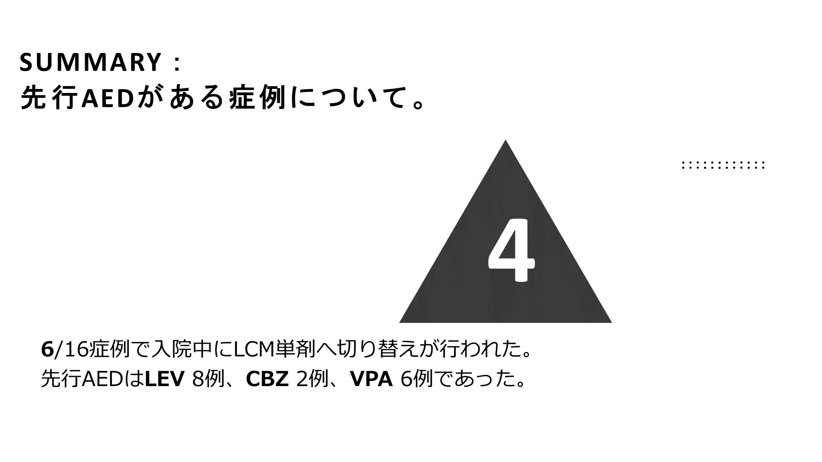 先行AEDはLEV 8例、CBZ 2例、VPA 6例であった。 SUMMARY: