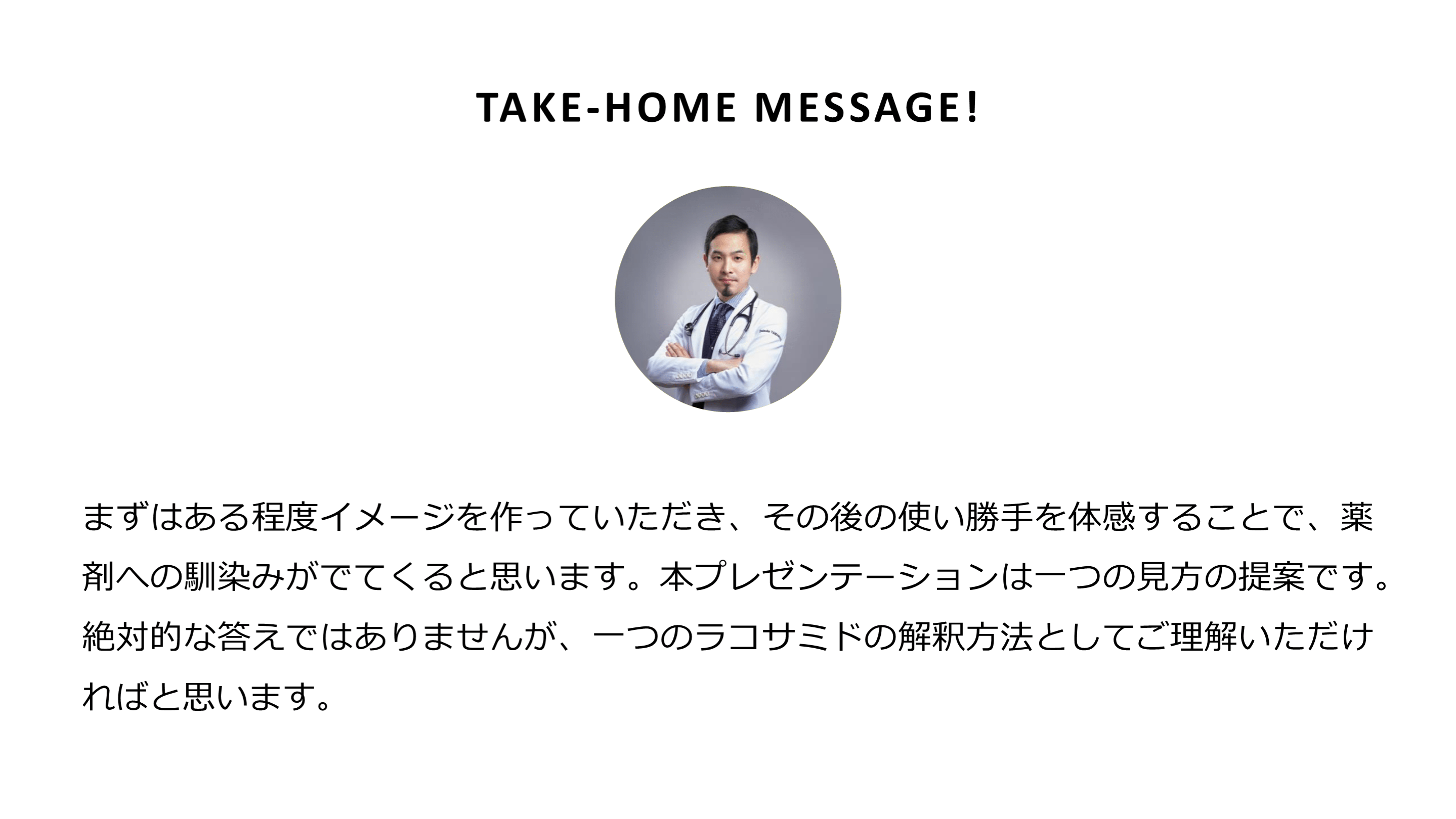 #83. まずはある程度イメージを作っていただき、その後の使い勝手を体感することで、薬剤への馴染みがでてくると思います。本プレゼンテーションは一つの見方の提案です。絶対的な答えではありませんが、一つのラコサミドの解釈方法としてご理解いただければと思います。 TAKE-HOME MESSAGE!