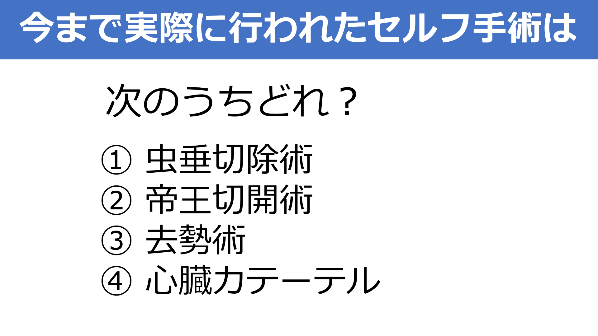 自分で自分自身に外科手術を行うことを「セルフ手術(self-surgery)」と呼びます。セルフ虫垂切除術、セルフ帝王切開術、セルフ去勢術、セルフ心臓カテーテルなど、先人の猛者たちの事例を紹介します。
