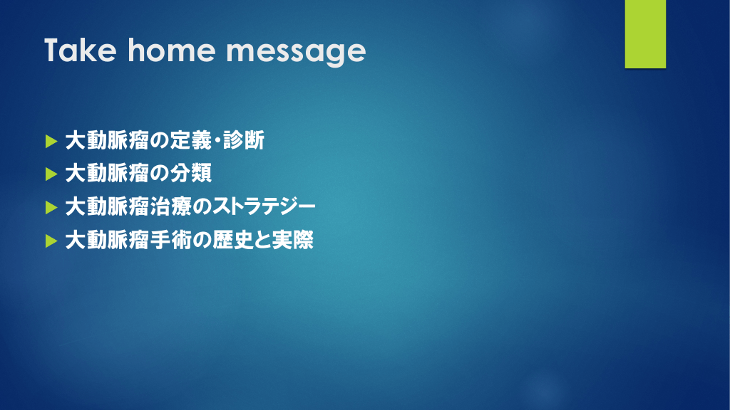 #3. Take home message u 大動脈瘤の定義・診断 u 大動脈瘤の分類 u 大動脈瘤治療のストラテジー u 大動脈瘤手術の歴史と実際