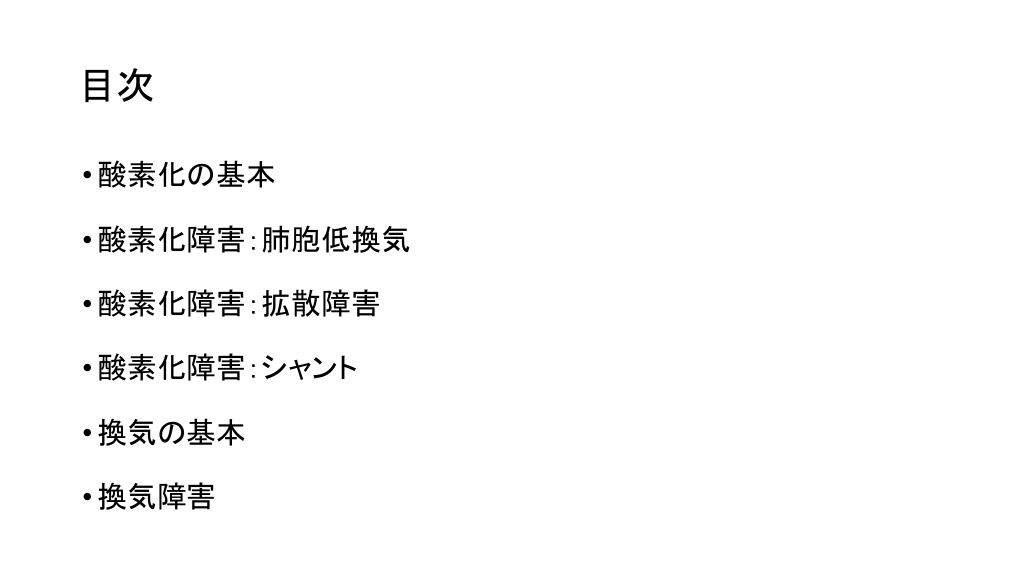 PICUでの呼吸管理の基礎となる「酸素化」と「換気」について整理するスライドです。低酸素血症の4つの原因(低換気、拡散障害、シャント、V/Q不均等)を体系的に学び、臨床でのアセスメント能力向上を目指します。