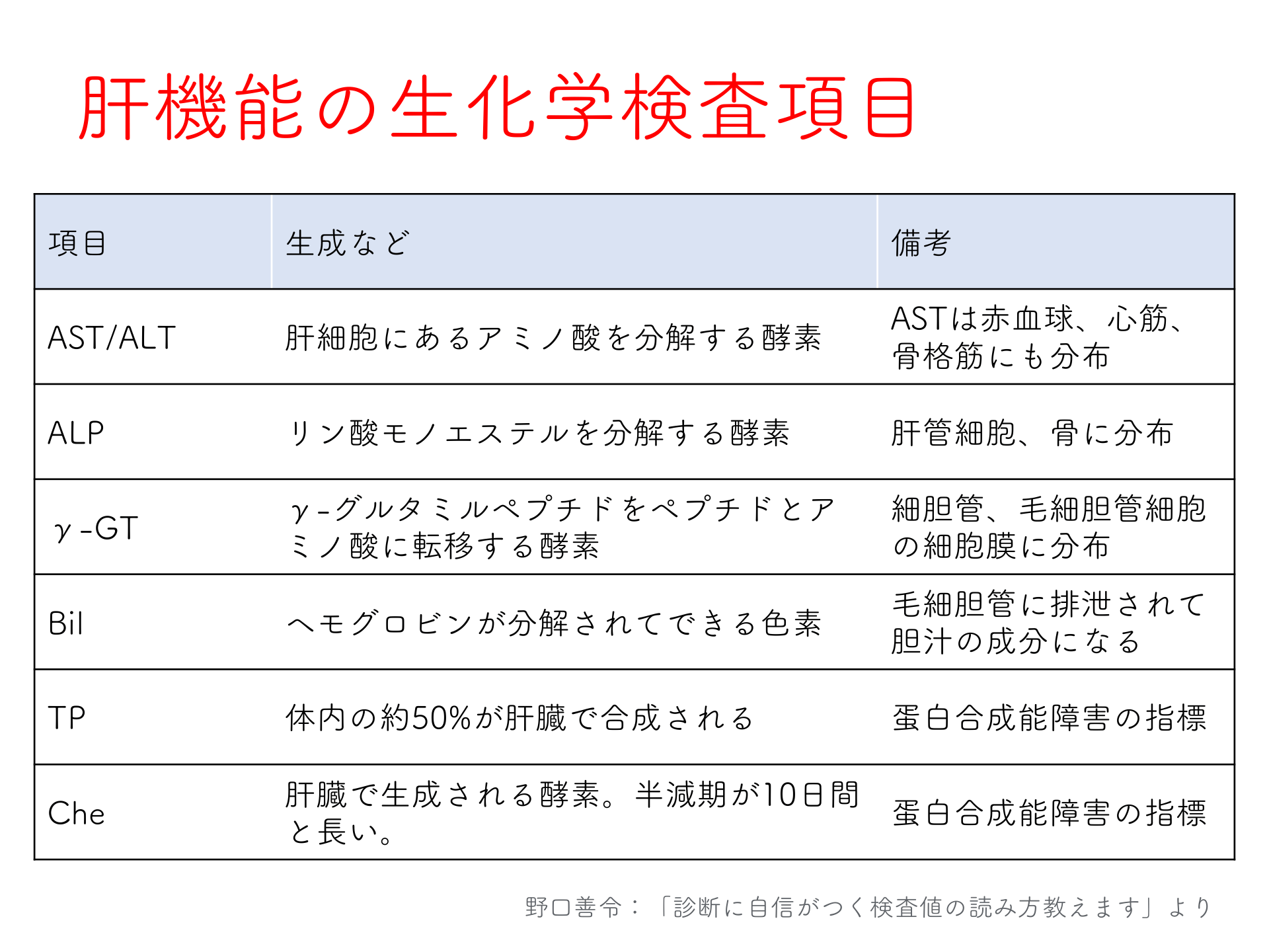 #10. 肝機能の生化学検査項目 項目 生成など 備考 AST/ALT 肝細胞にあるアミノ酸を分解する酵素 ASTは赤血球、心筋、 骨格筋にも分布 ALP リン酸モノエステルを分解する酵素 肝管細胞、骨に分布 γ-GT γ-グルタミルペプチドをペプチドとア ミノ酸に転移する酵素 細胆管、毛細胆管細胞 の細胞膜に分布 Bil ヘモグロビンが分解されてできる色素 毛細胆管に排泄されて 胆汁の成分になる TP 体内の約50%が肝臓で合成される 蛋白合成能障害の指標 Che 肝臓で生成される酵素。半減期が10日間 蛋白合成能障害の指標 と長い。 野口善令:「診断に自信がつく検査値の読み方教えます」より
