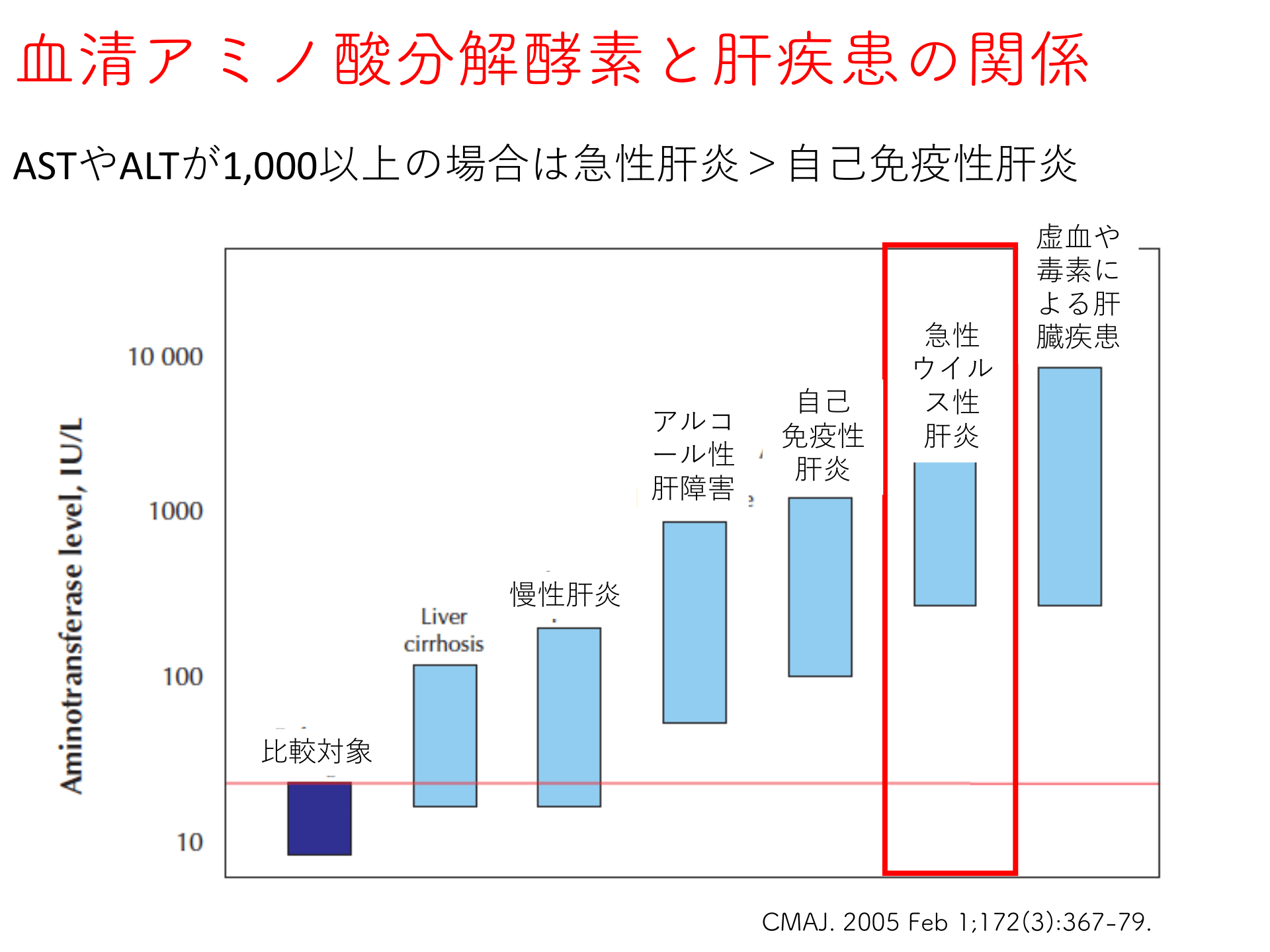 #11. 血清アミノ酸分解酵素と肝疾患の関係 ASTやALTが1,000以上の場合は急性肝炎>⾃⼰免疫性肝炎 アルコ ール性 肝障害 ⾃⼰ 免疫性 肝炎 急性 ウイル ス性 肝炎 虚⾎や 毒素に よる肝 臓疾患 慢性肝炎 ⽐較対象 CMAJ. 2005 Feb 1;172(3):367-79.
