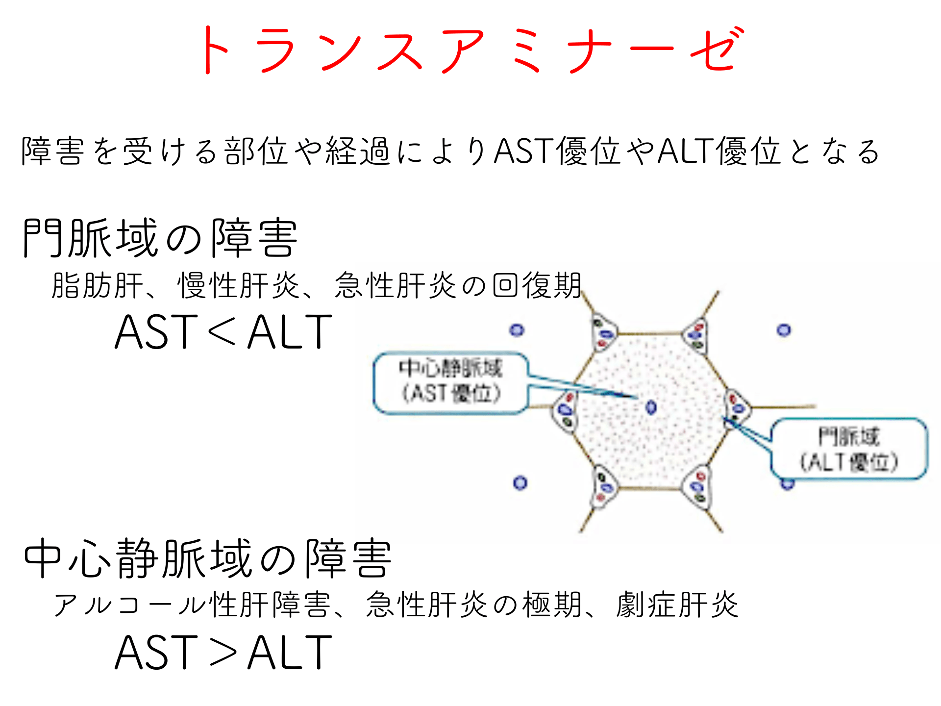 #12. トランスアミナーゼ 障害を受ける部位や経過によりAST優位やALT優位となる 門脈域の障害 脂肪肝、慢性肝炎、急性肝炎の回復期 AST<ALT 中心静脈域の障害 アルコール性肝障害、急性肝炎の極期、劇症肝炎 AST>ALT